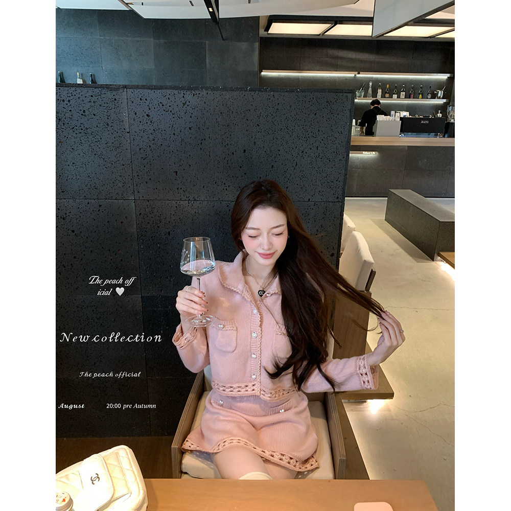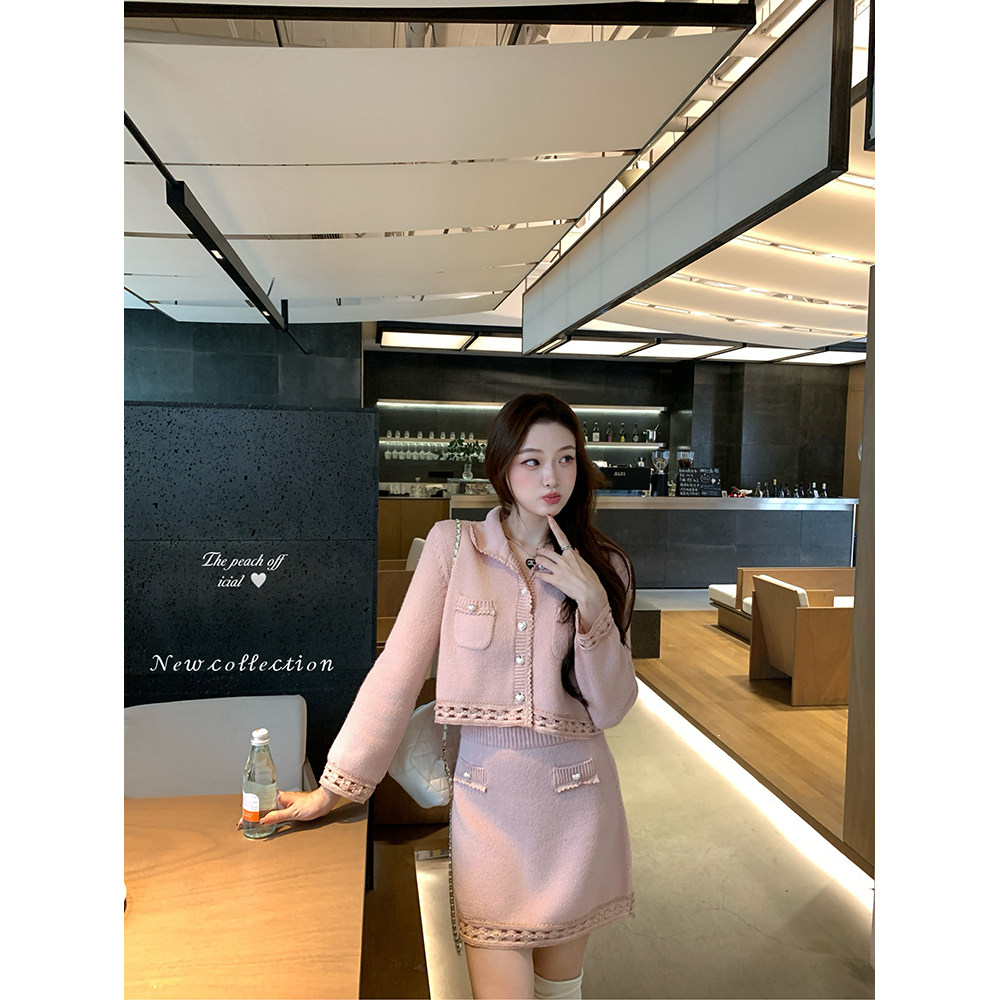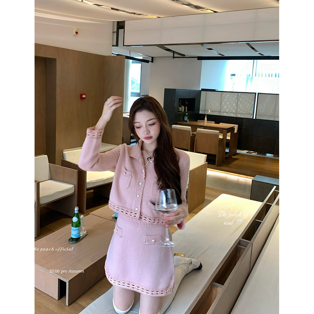 thepeachofficial【普罗玫瑰】粉色定染蕾丝拼接羊毛开衫半裙套装