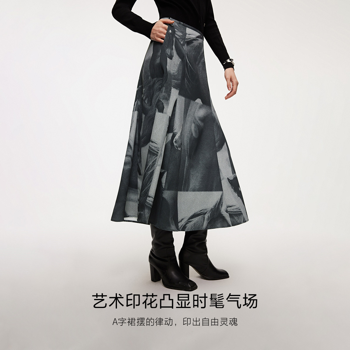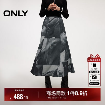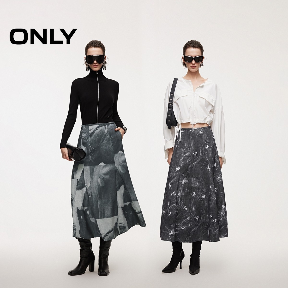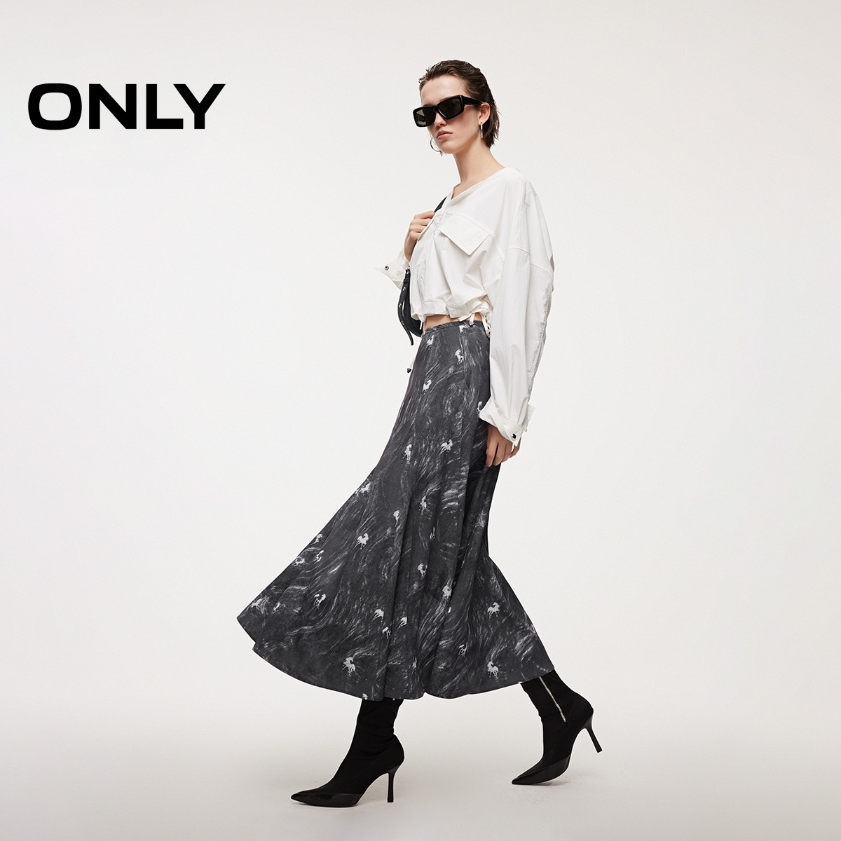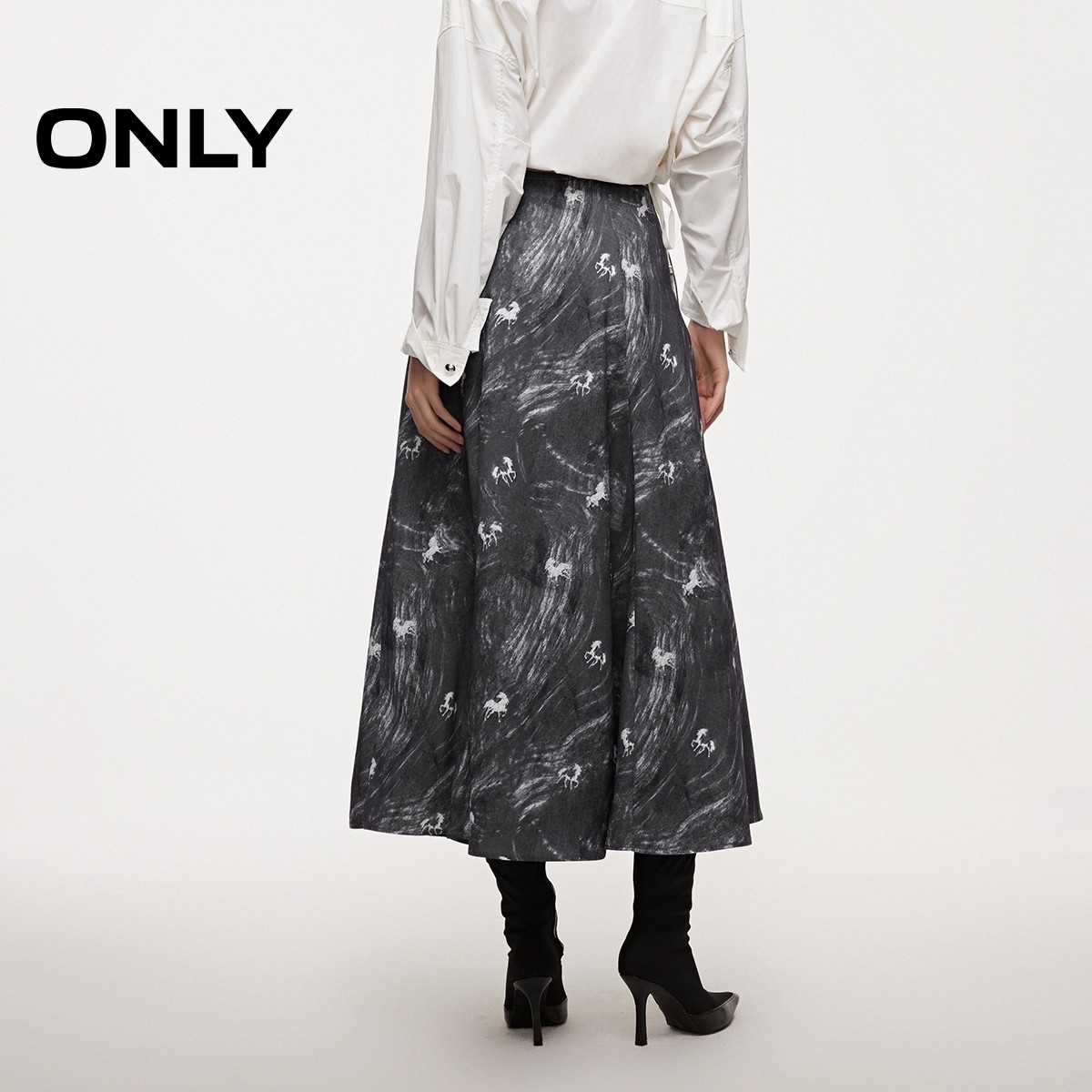ONLY2026春季新款艺术骏马印花腰侧隐形拉链A字伞裙长裙半身裙女