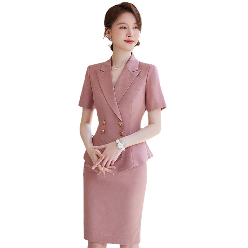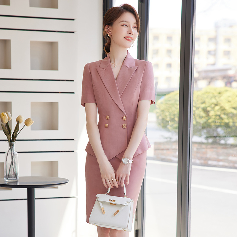 主持人主播高级感甜粉色西装套装女职业两件套裙美容院教师工作服
