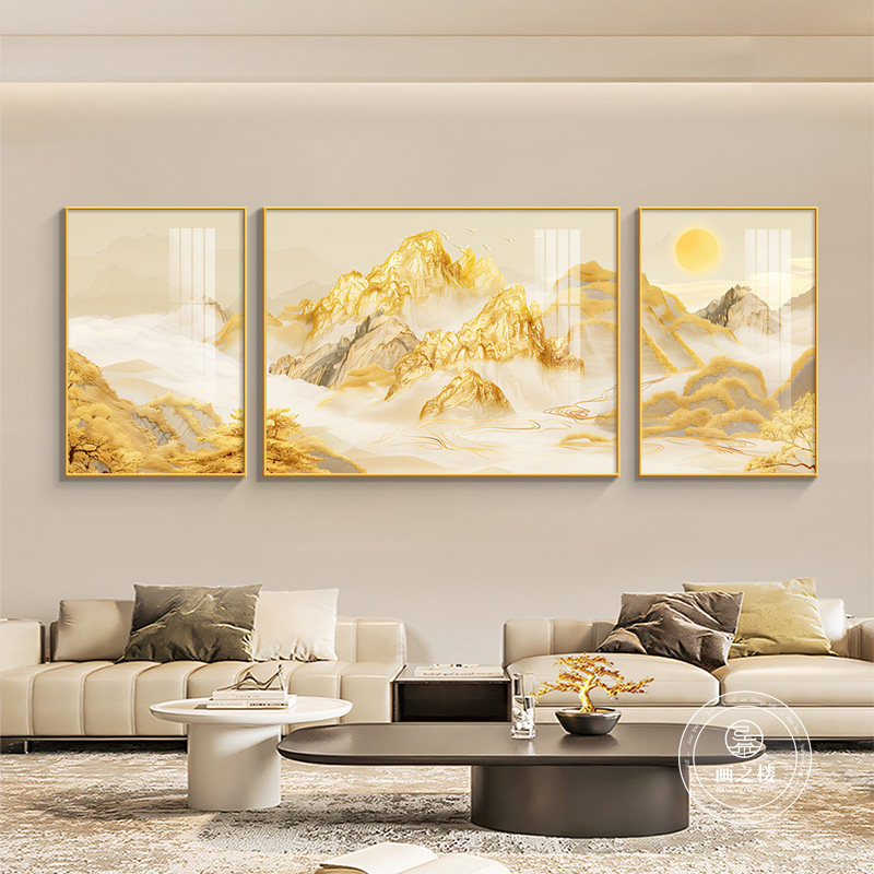 日照金山客厅沙发背景墙三联画高级感金箔装饰画现代简约招财挂画