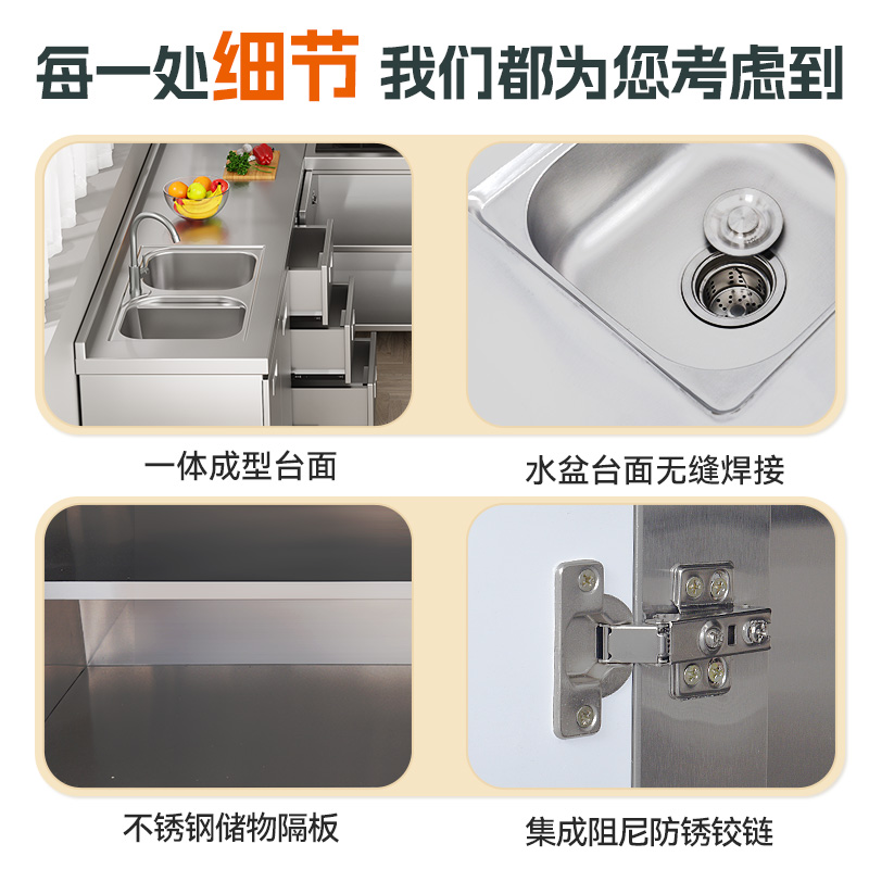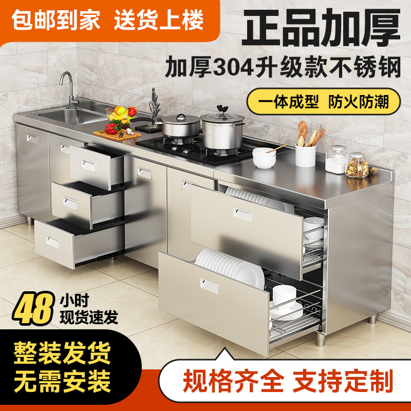 304不锈钢橱柜厨房灶台一体成型整体加厚洗菜盆组合柜储物柜定制