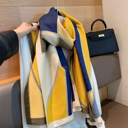 黄蓝抽象图案长款披肩女秋冬季百搭加厚保暖仿羊绒围巾两用大围脖