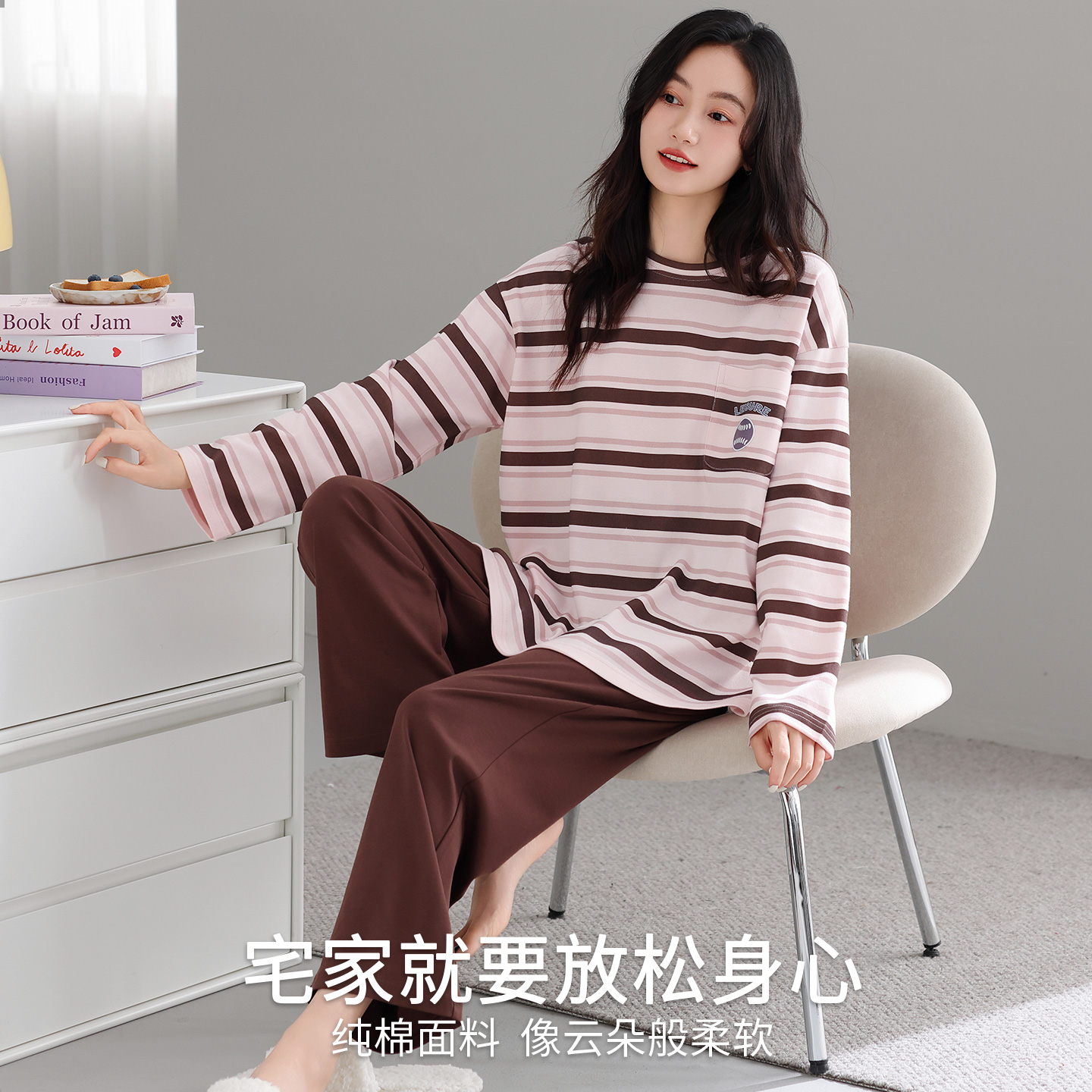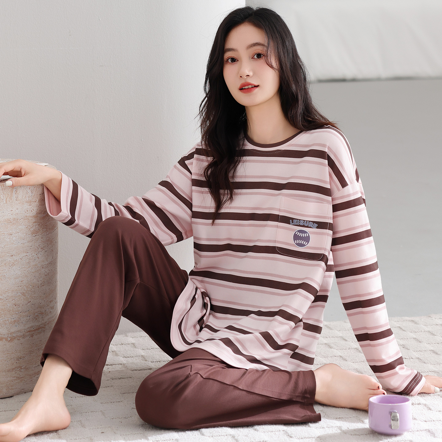 芬腾可安长袖睡衣女款2025新款秋冬款纯棉带胸垫条纹家居服秋冬季