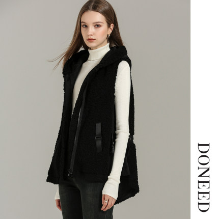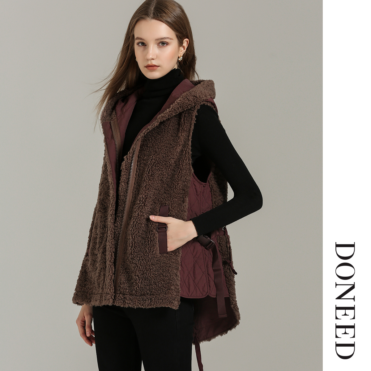 DONEED秋冬款休闲简约男友风拼接设计感宽松连帽棉衣马甲外套女