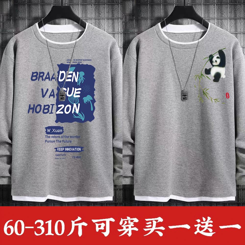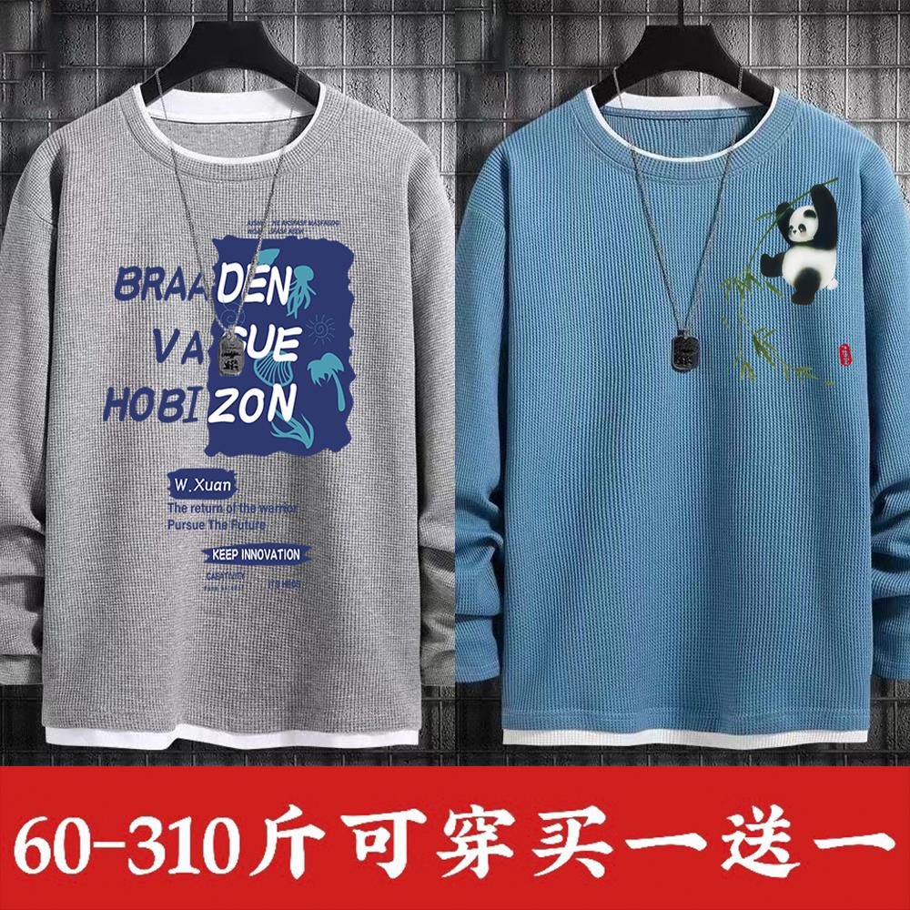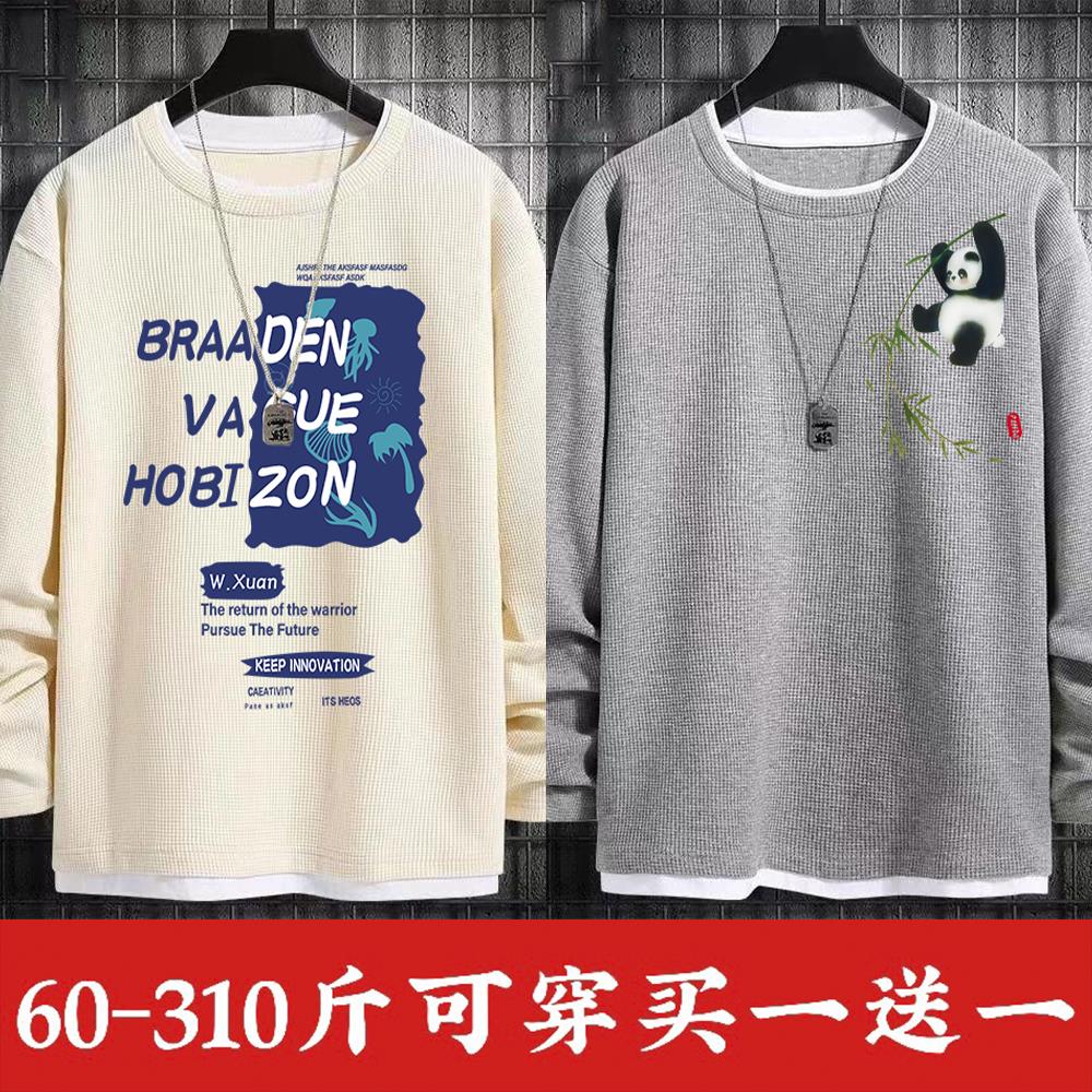 男士两件装华夫格上衣春秋重磅圆领长袖T恤衫大码男士宽松打底衫