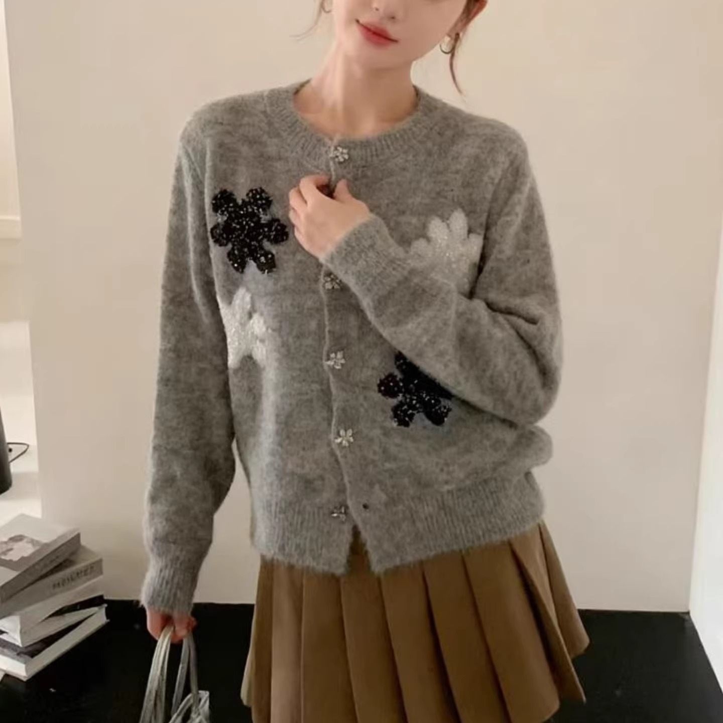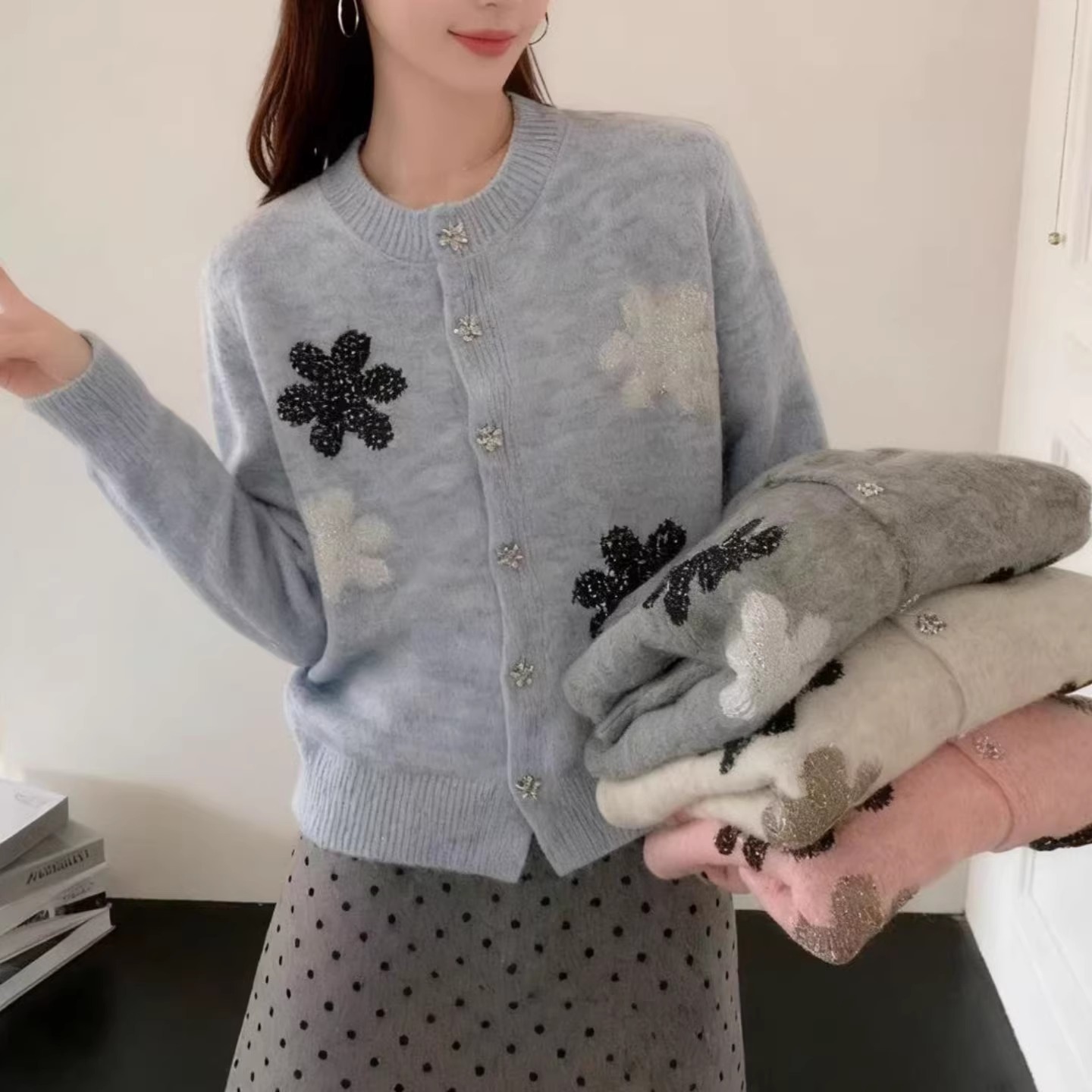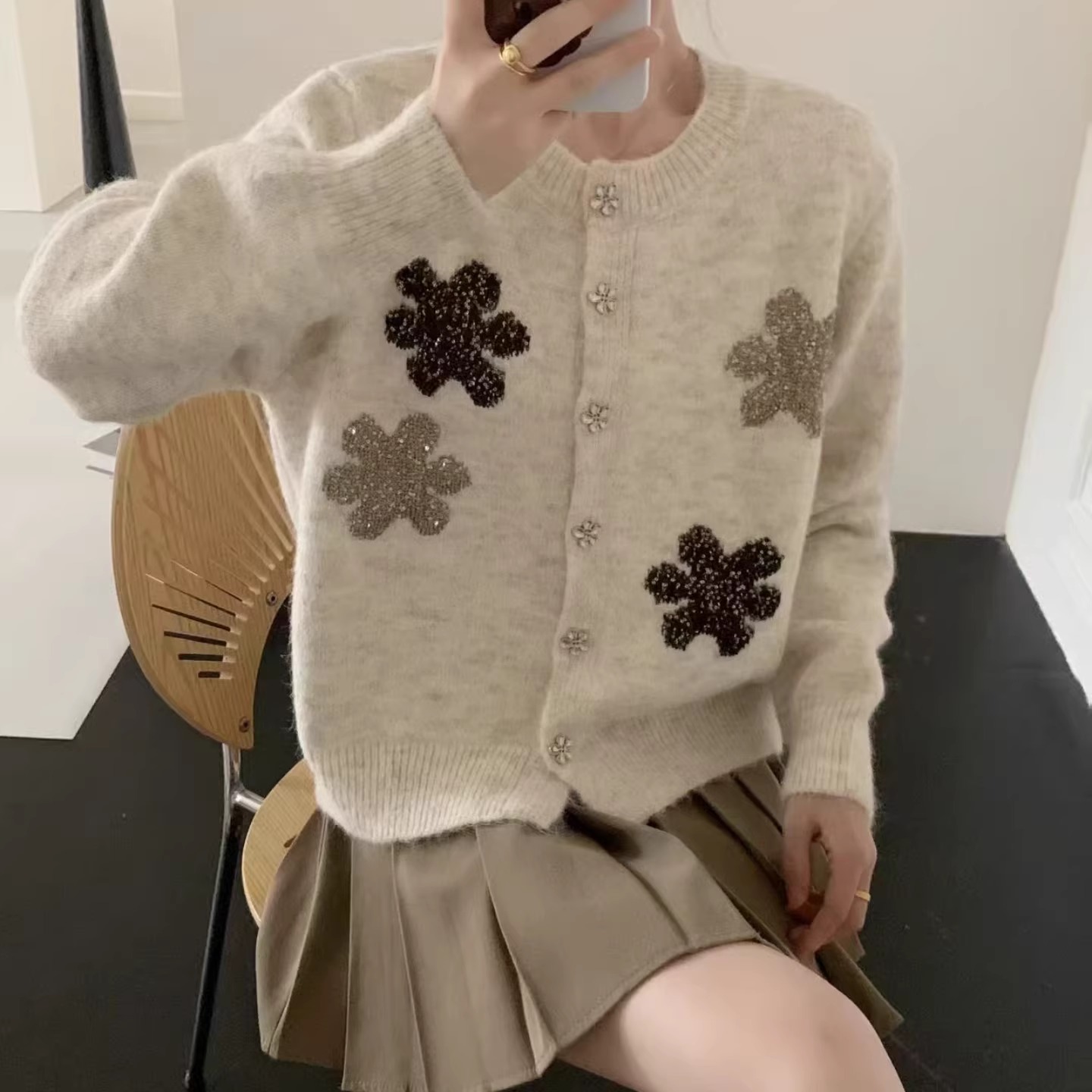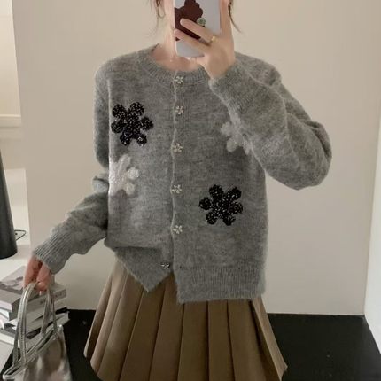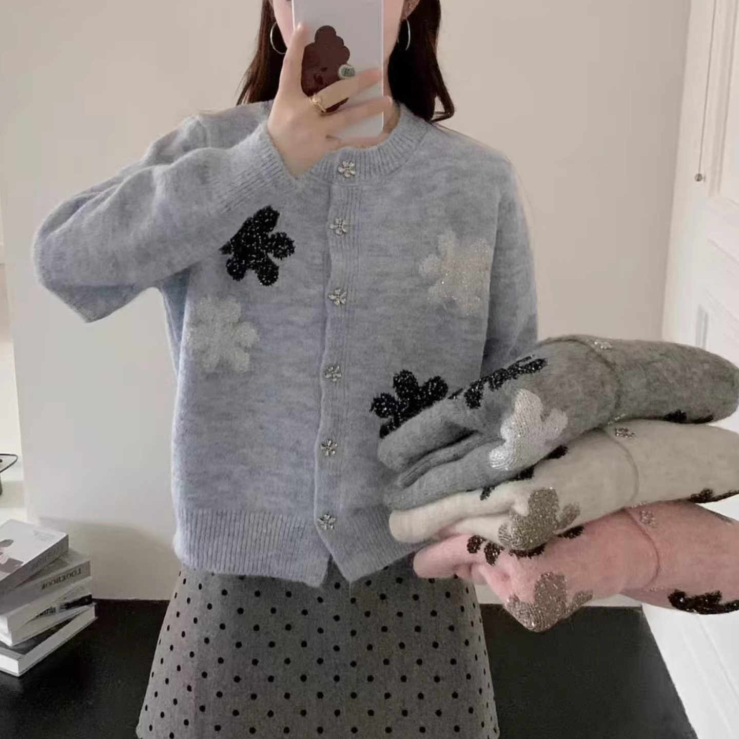 立体花朵毛衣开衫女秋冬2025新款宽松显瘦减龄洋气短款针织衫上衣