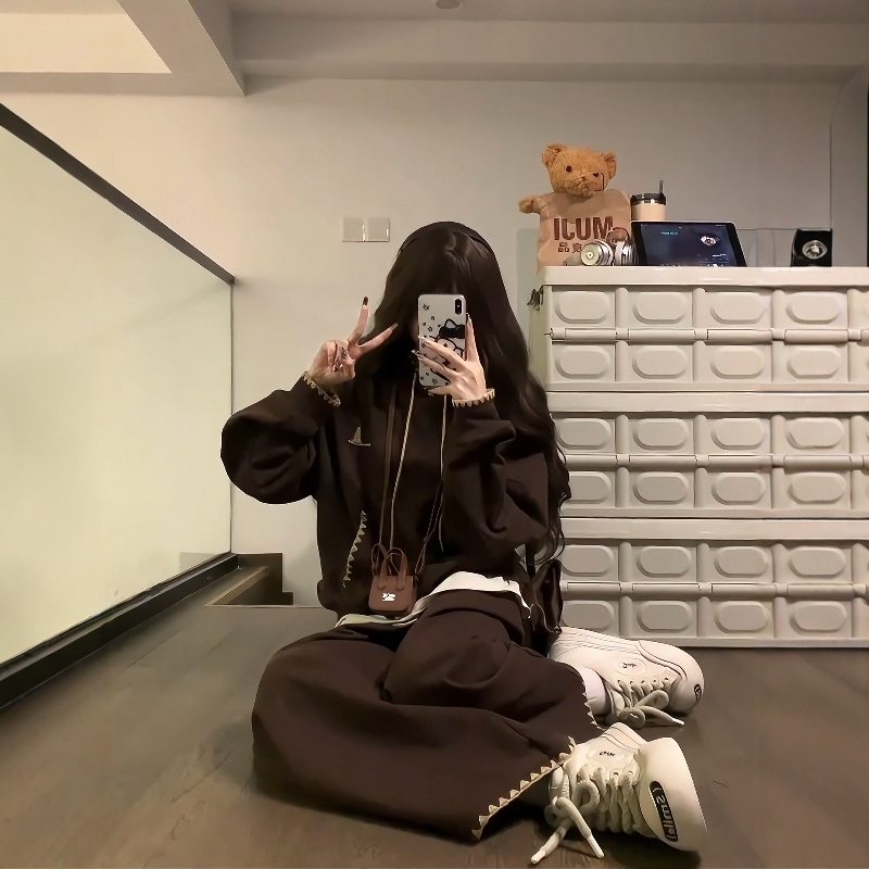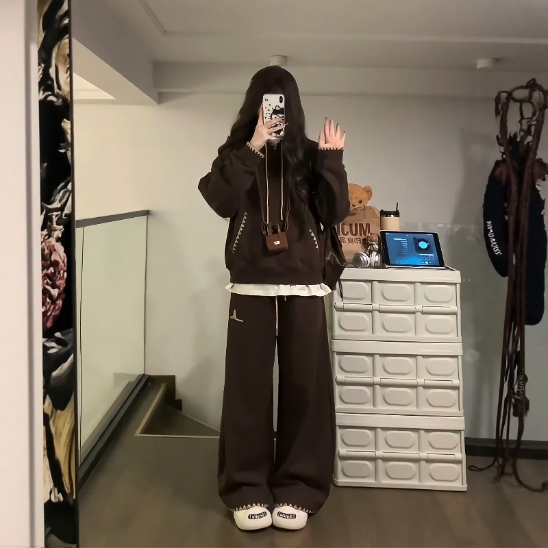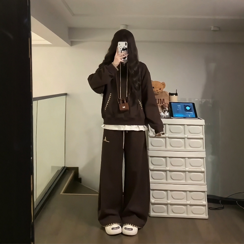 2025新款美式复古休闲运动服套装女秋冬连帽卫衣阔腿裤OOTD两件套
