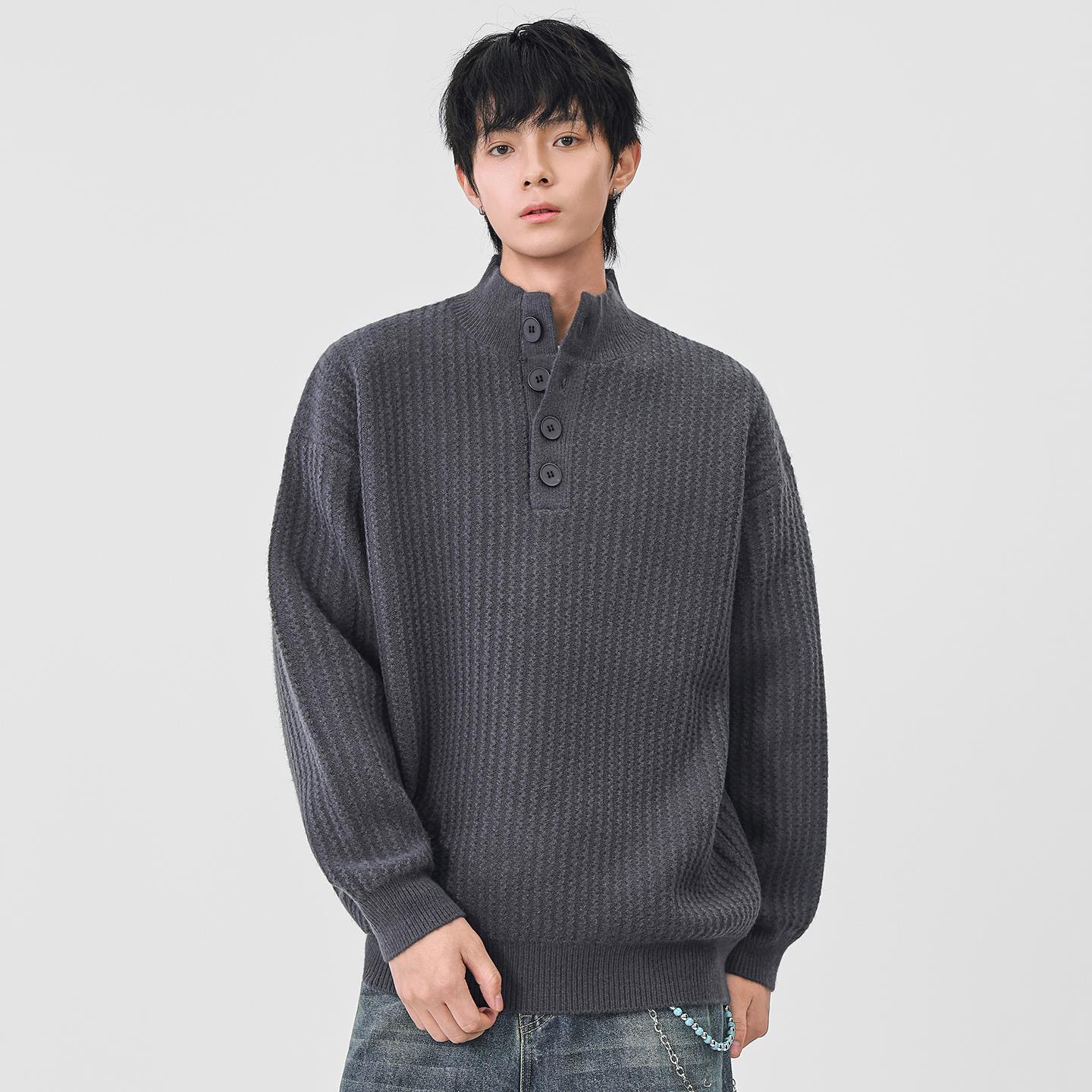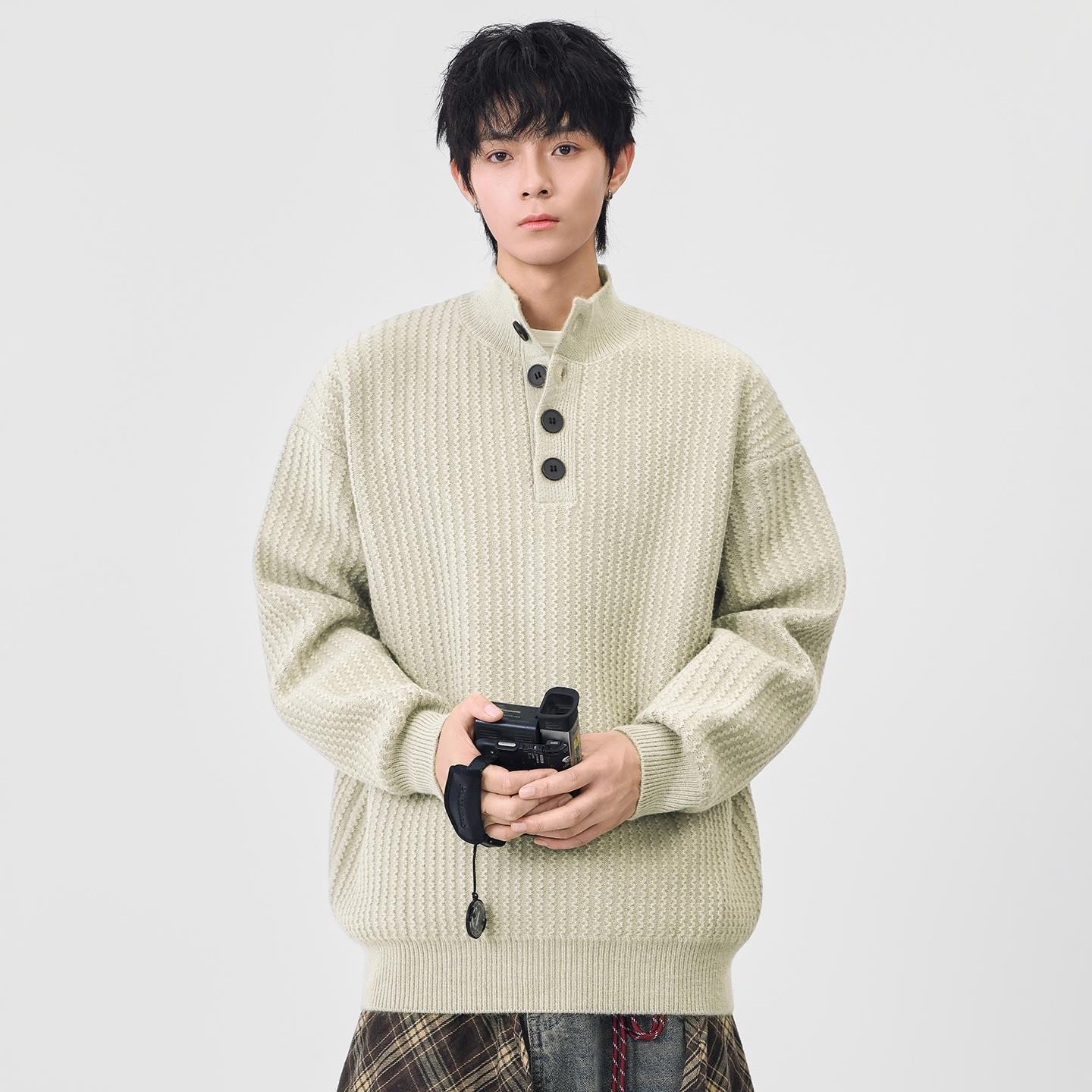 以纯针织衫男秋冬季套头立领纽扣套头百搭毛衣日系宽松潮流