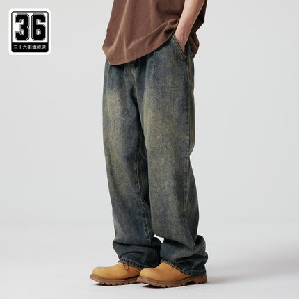 复古水洗黄泥染阔腿牛仔裤男宽松春季新款直筒裤美式潮牌百搭裤子