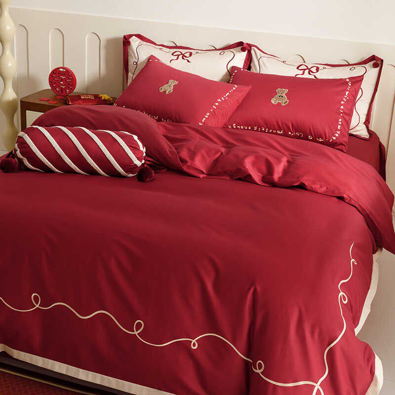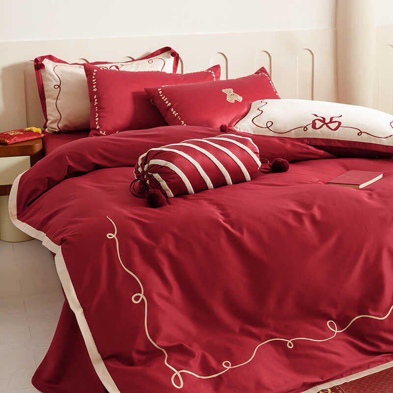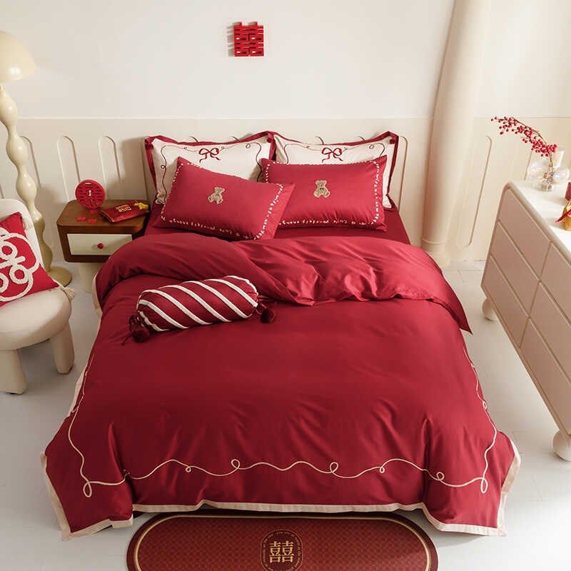 婚庆高支长绒g棉结婚四件套全棉高级感大红色刺绣床单被套婚嫁喜
