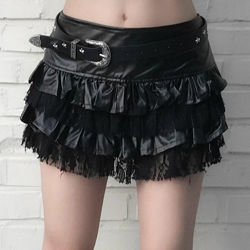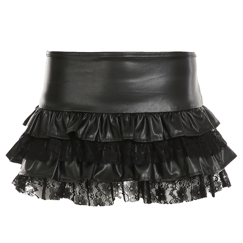 MSYOUCAN 朋克亚比暗黑风蕾丝拼接PU半身裙低腰层次感百搭蛋糕裙