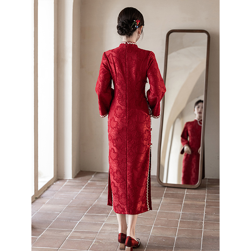 红色新中式旗袍敬酒服新娘年轻款倒大袖提花结婚绝美订婚礼服裙