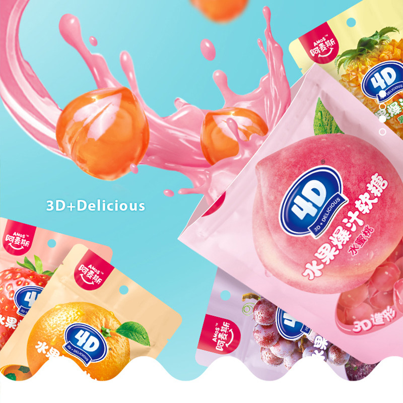 阿麦斯4d爆浆爆汁水蜜桃葡萄味夹心果汁软糖橡皮糖果味糖果小零食
