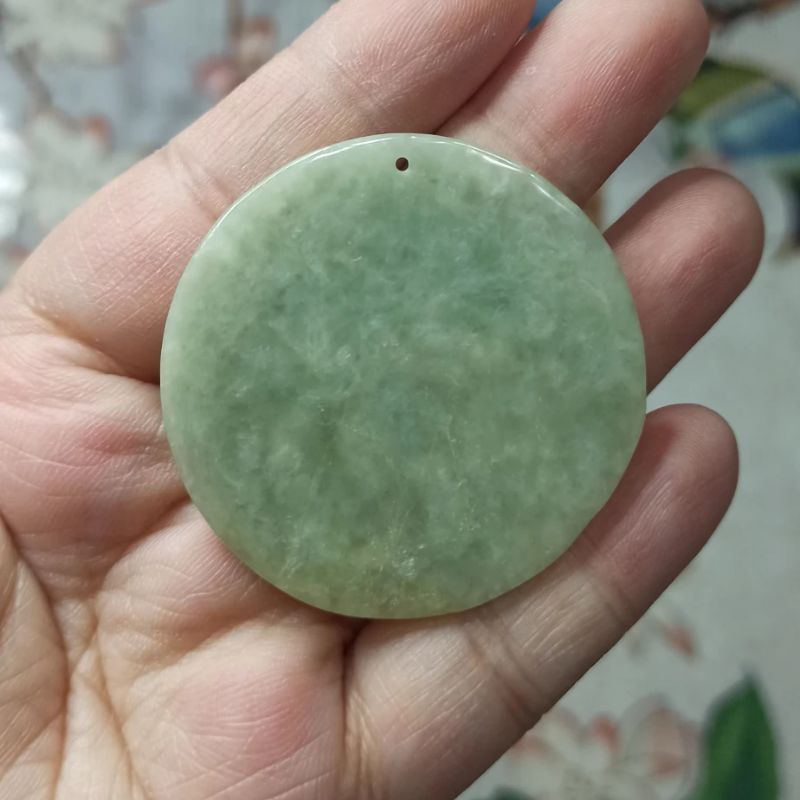 114缅甸天然翡翠吊坠山水牌茶色飘花圆牌雕刻手把件直径44mm左右
