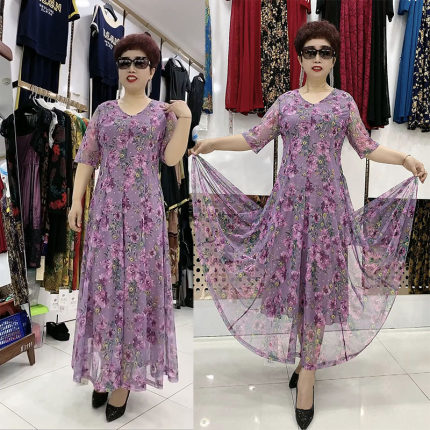 气质妈妈水晶丝大码连衣裙夏季新款中袖时尚弹力显瘦十片大摆裙女
