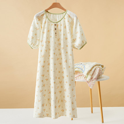 春夏季女纯棉纱布睡裙短袖家居裙中长款全棉连衣裙圆领套头可外穿