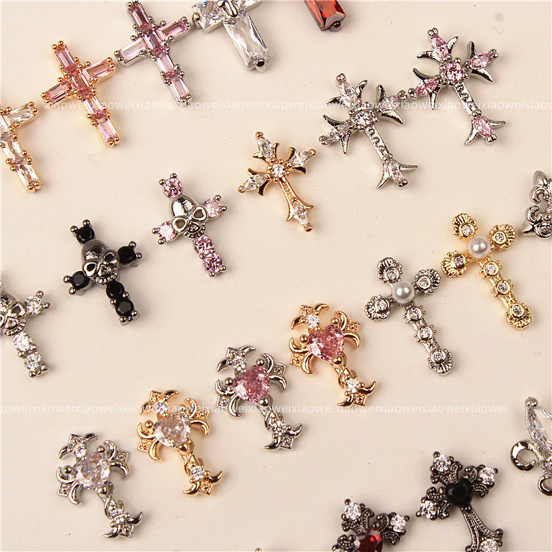 网红十字架美甲饰品复古朋克暗黑风镶钻超闪骷髅头锆石指甲钻配饰