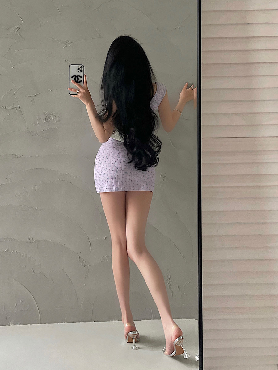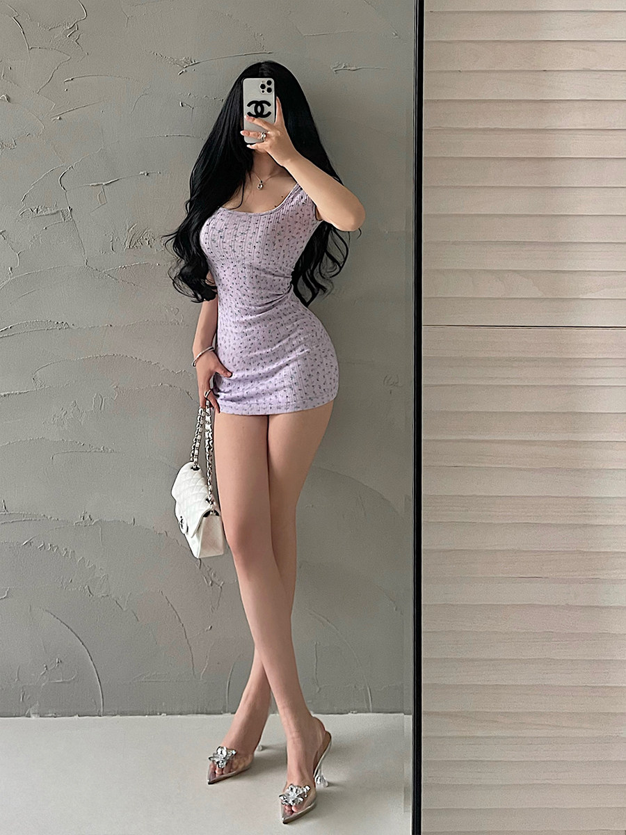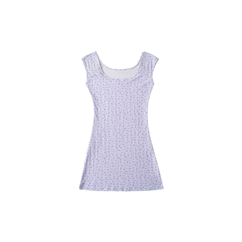 YoungGirlDay 纯欲风性感U领修身显瘦紫色碎花无袖包臀连衣裙短裙