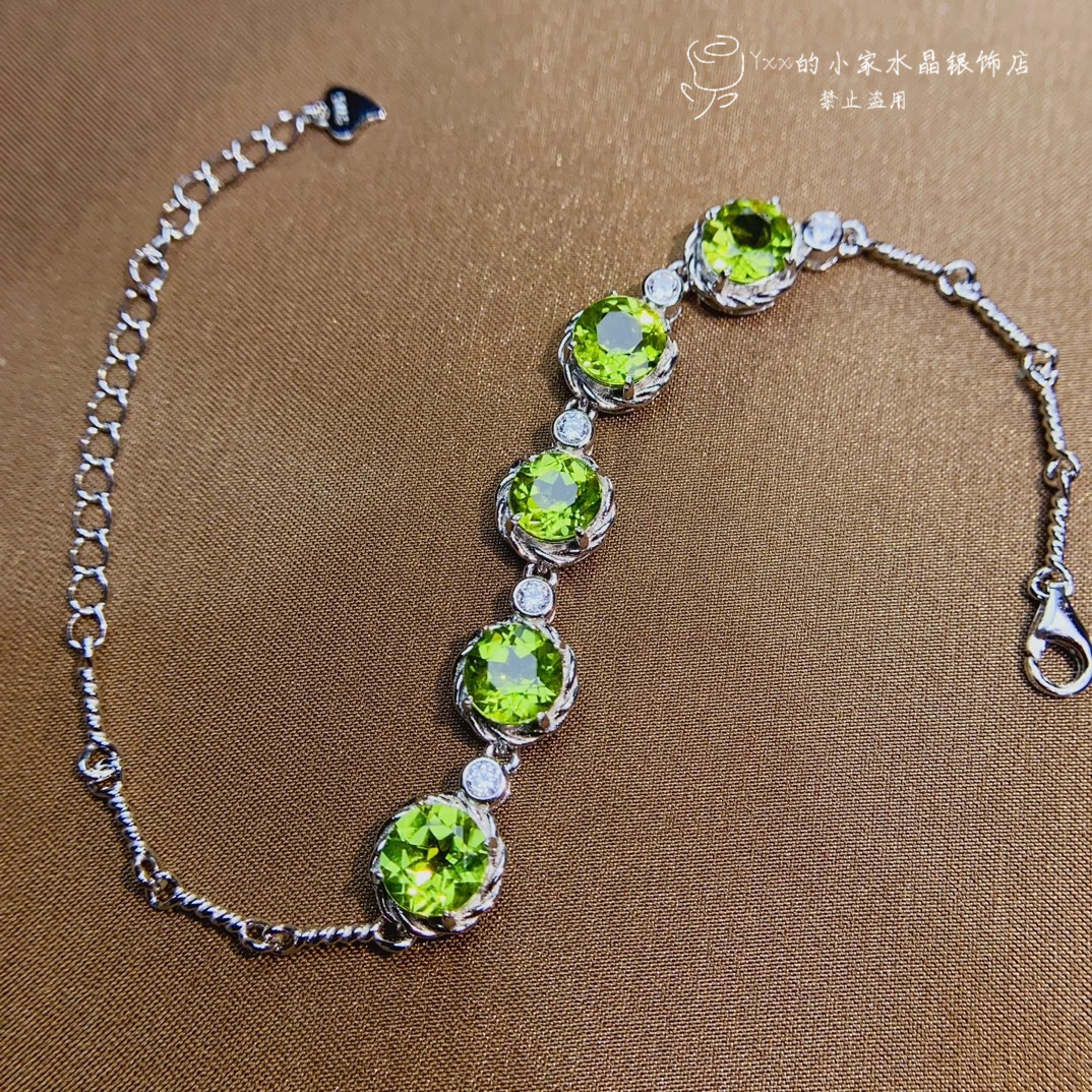 天然托帕石手链女 纯银镶嵌宝石8mm/同款橄榄石手链7mm银饰手环