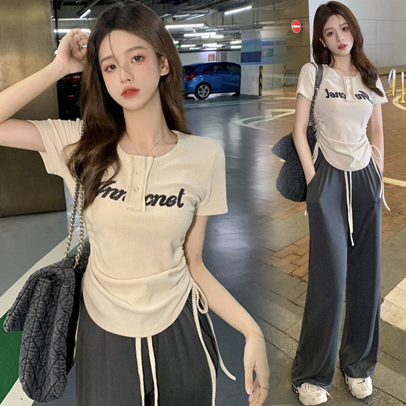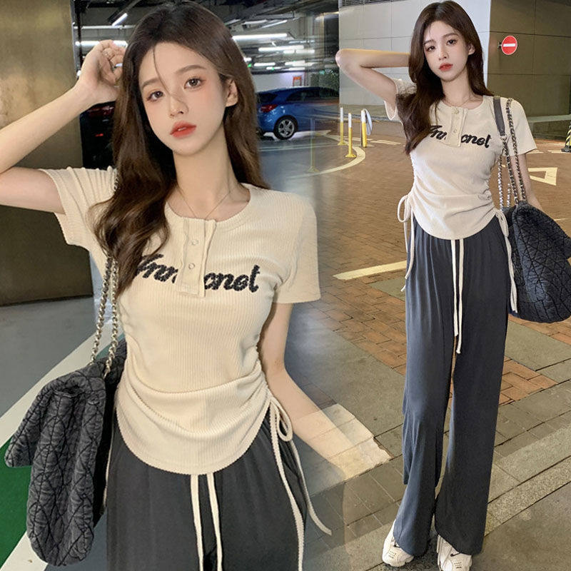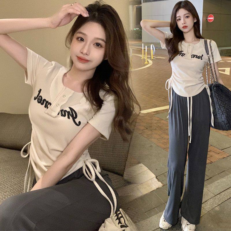 美式辣妹网红休闲套装女夏季时尚甜辣上衣抽绳冰丝长裤子两件套潮