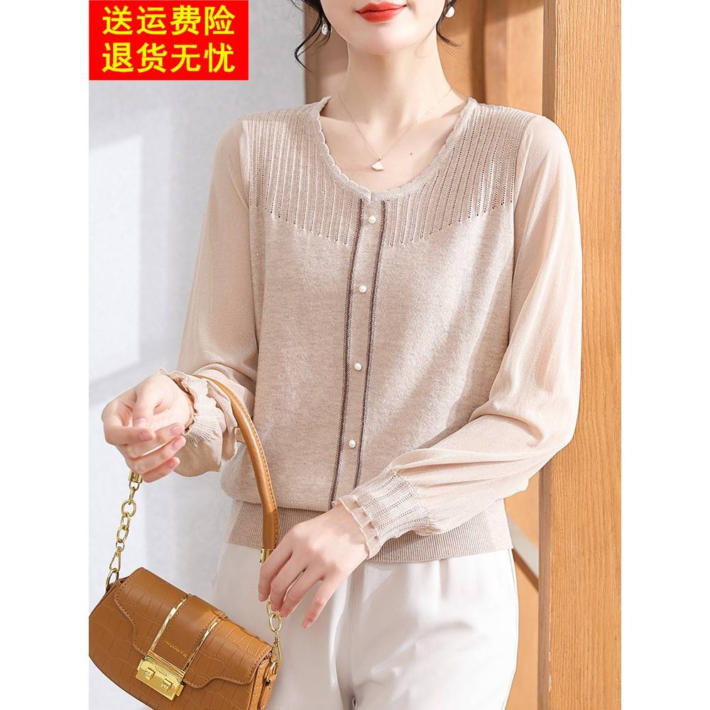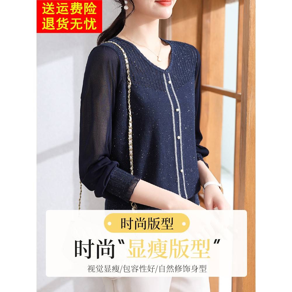 年轻妈妈春装长袖蕾丝减龄针织小衫2025新款中老年女装春秋上衣服