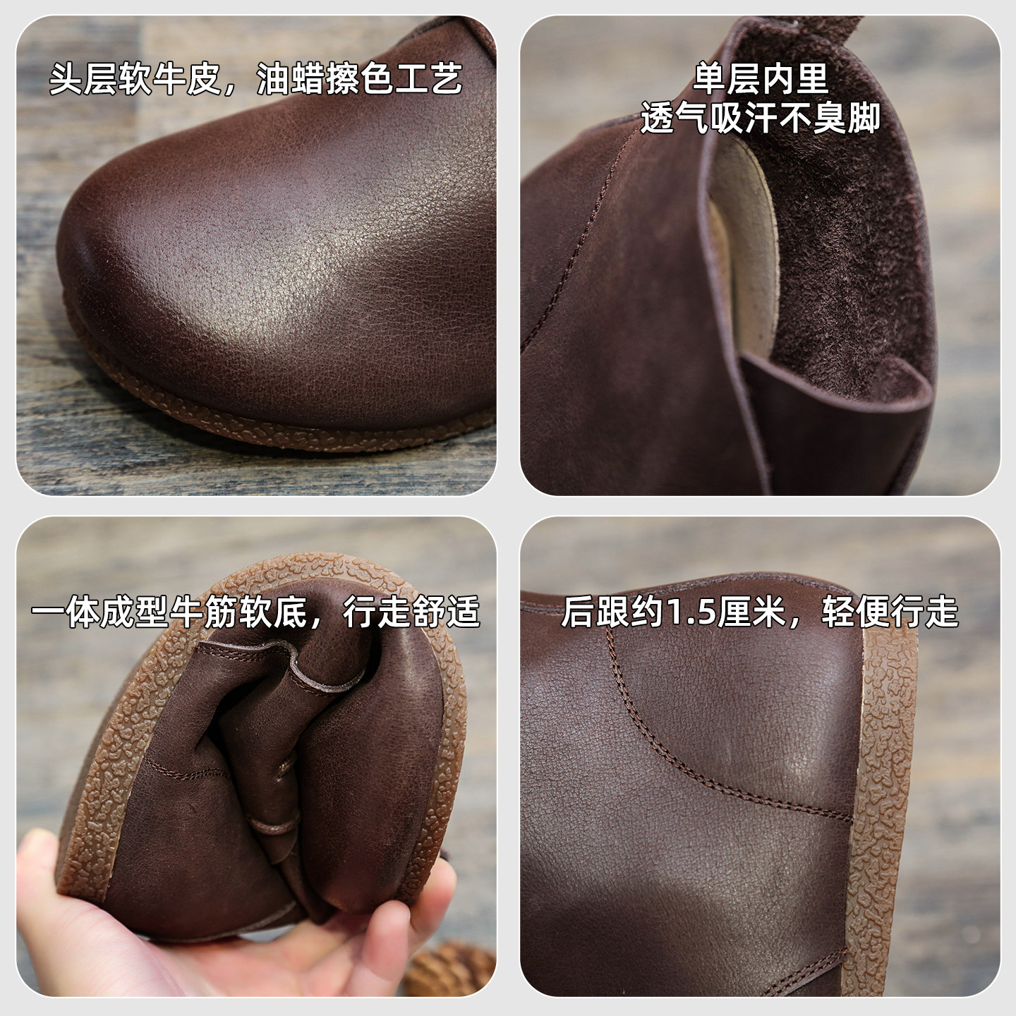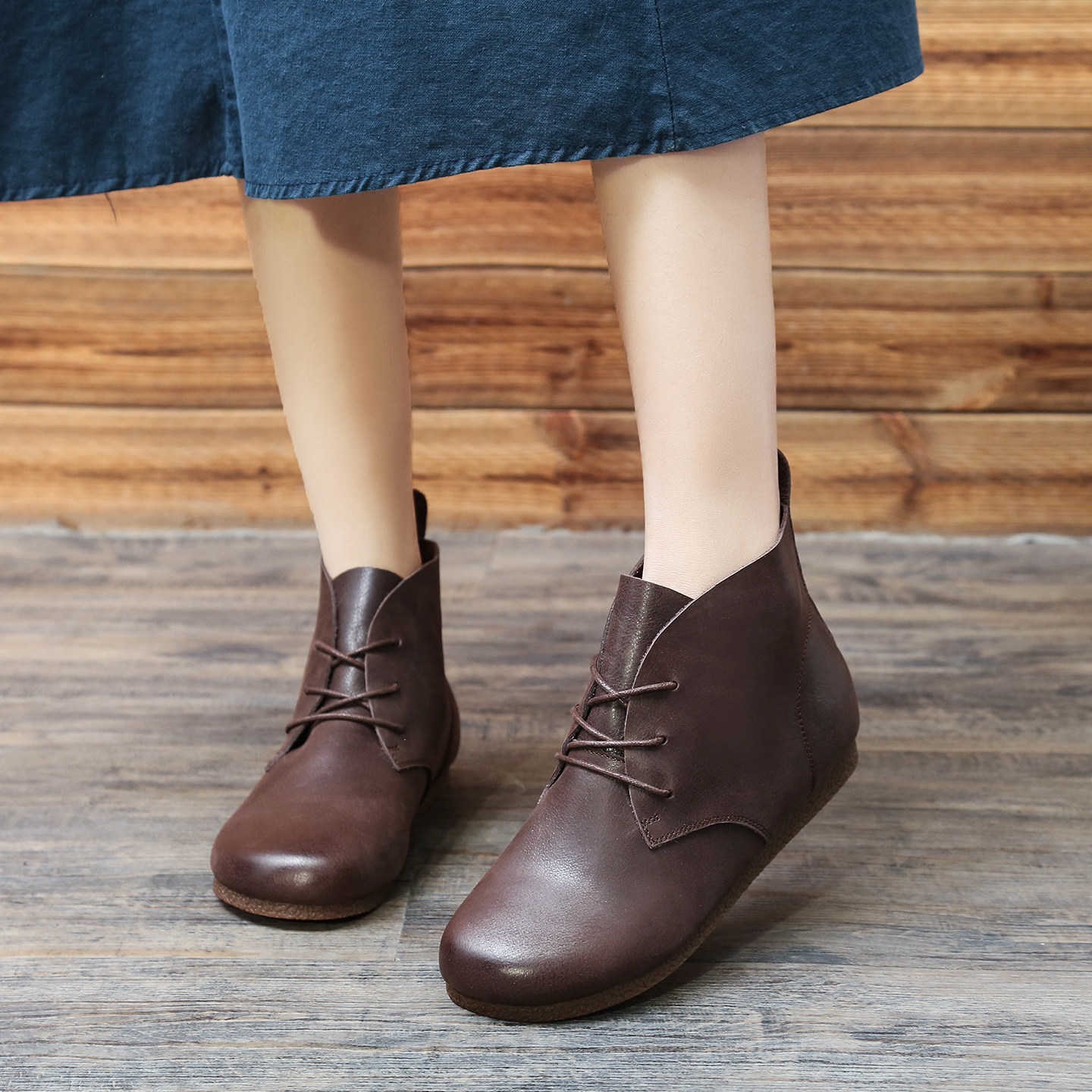头层牛皮森系擦色短筒平底马丁靴