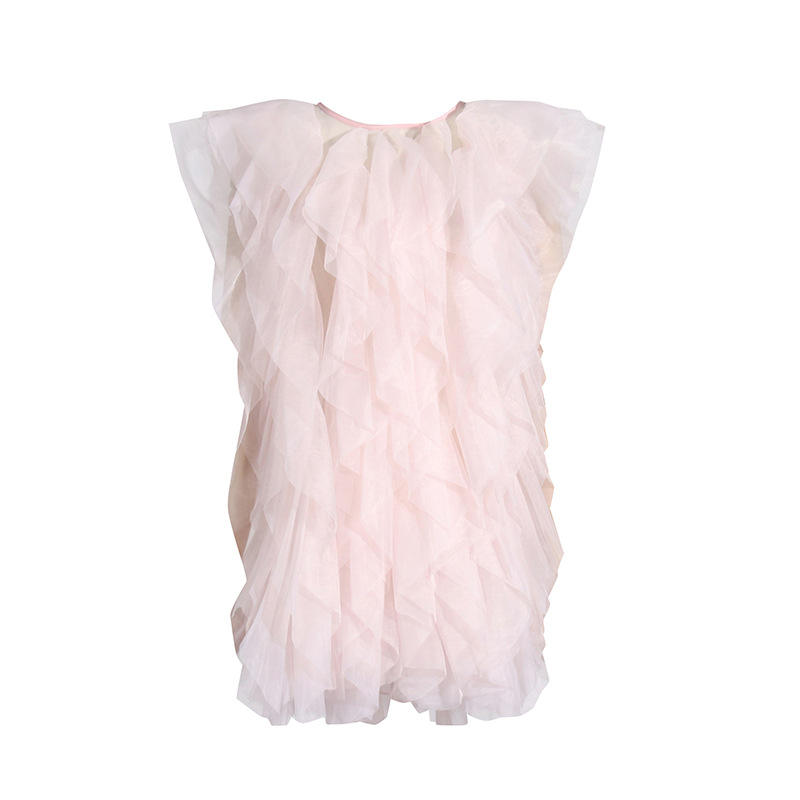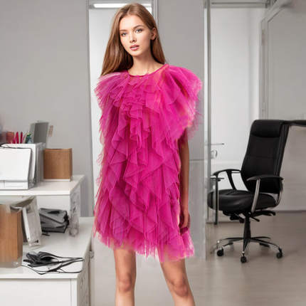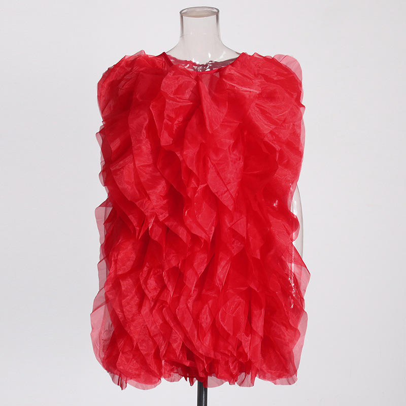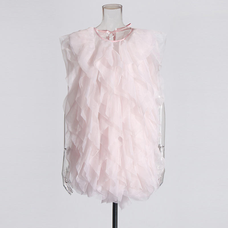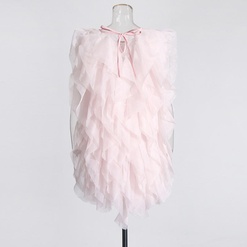 欧美气质无袖圆领网纱裙夏设计感拼接木耳边短款连衣裙女常规袖