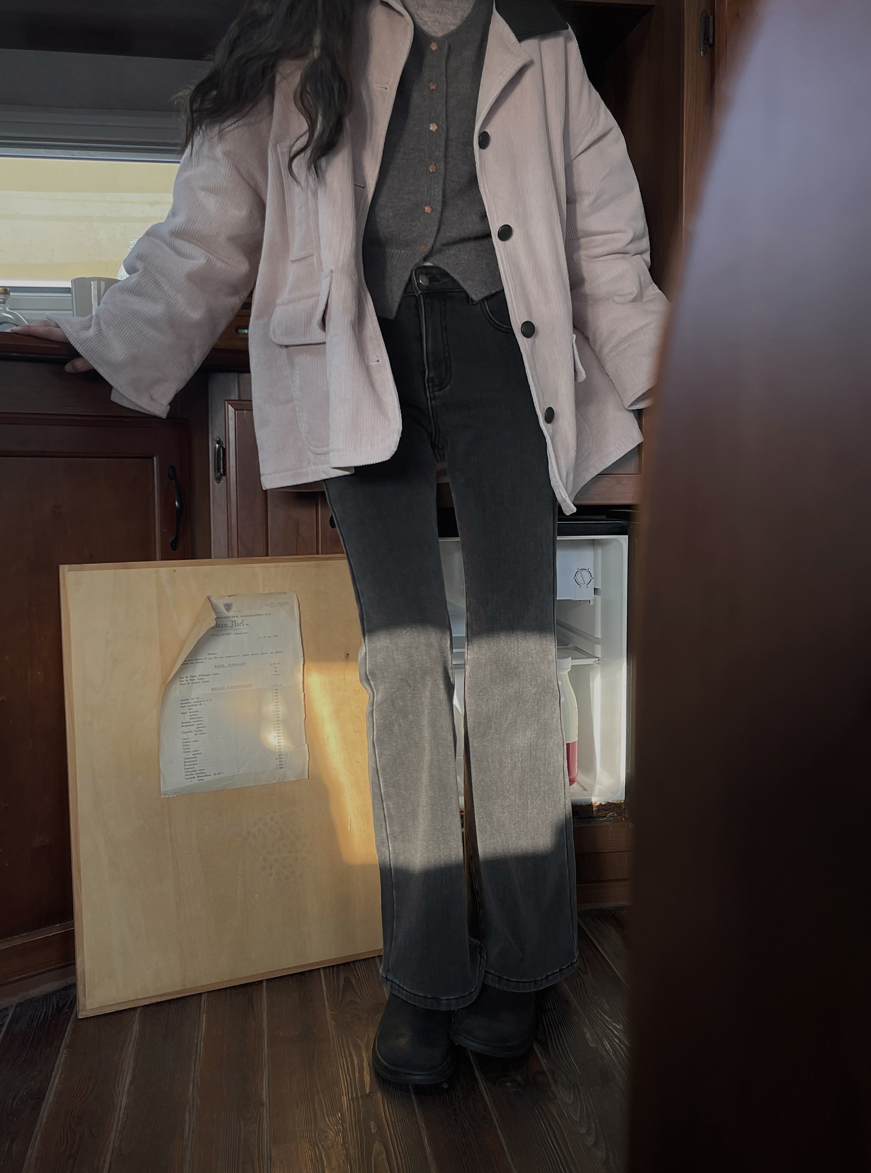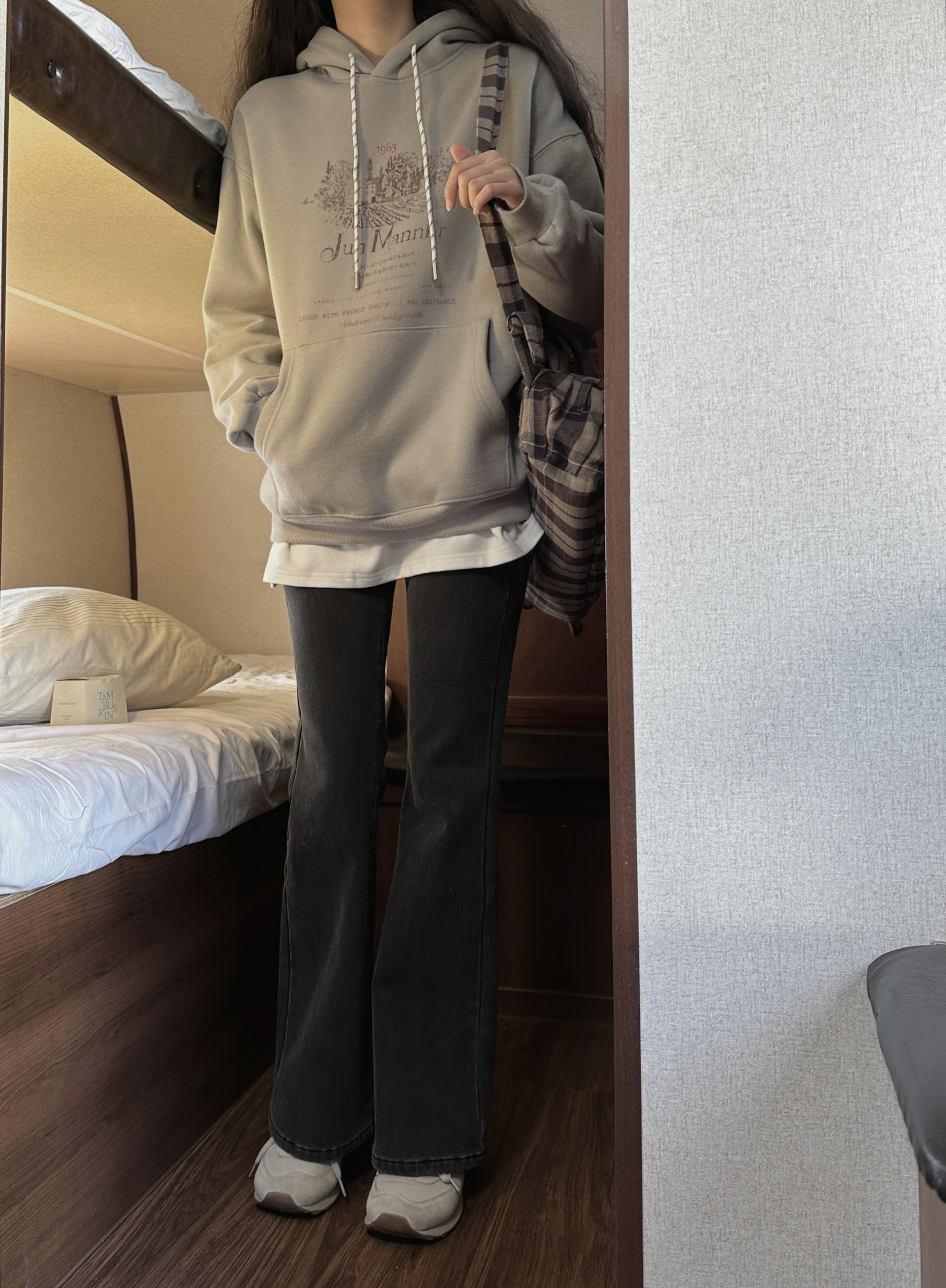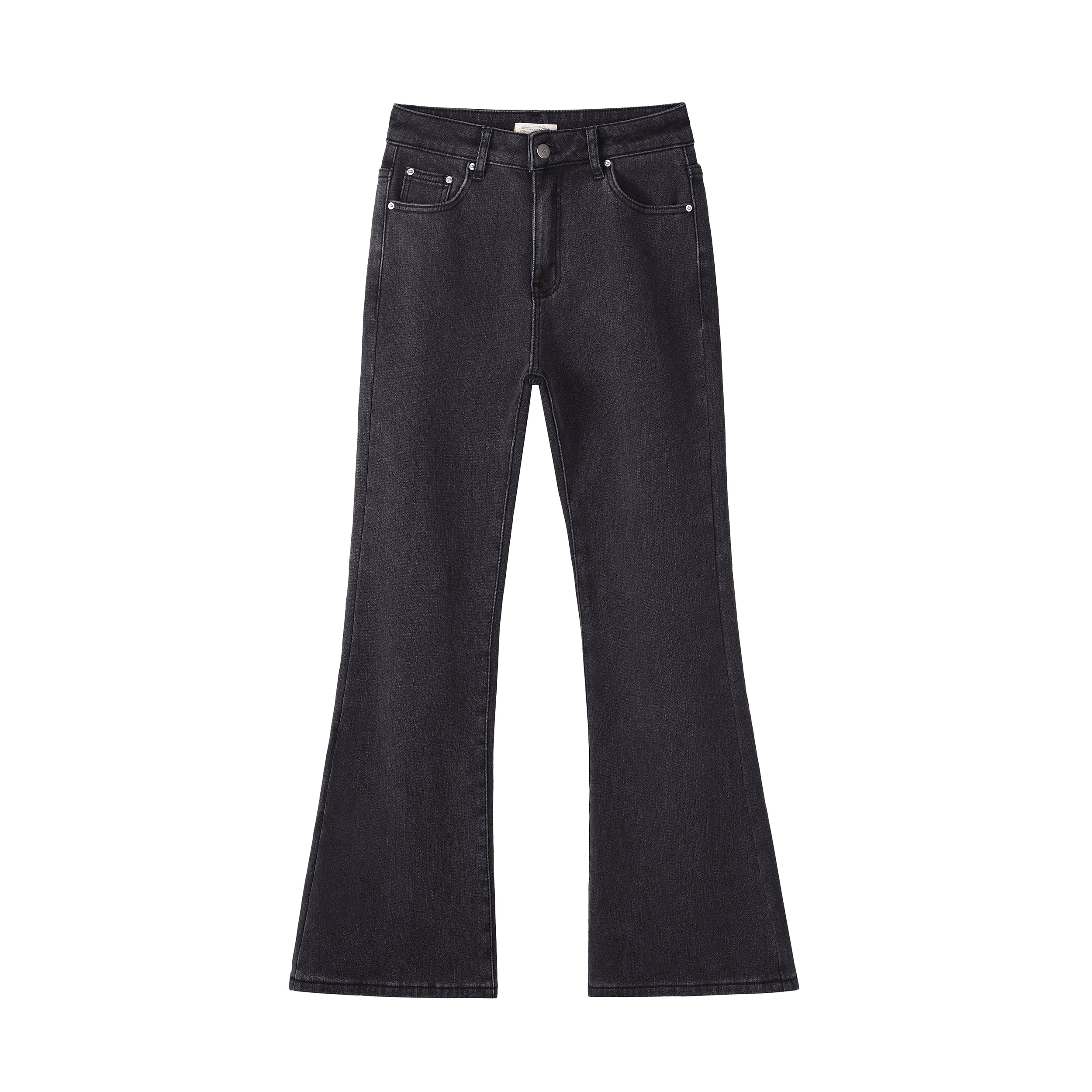 小个子灰色高腰微喇直筒牛仔裤