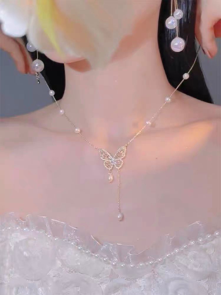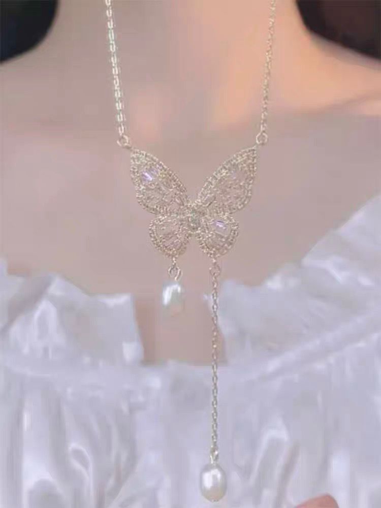 超仙时尚百搭珍珠项链女高级感气质轻奢锆石蝴蝶锁骨链冷淡风颈链