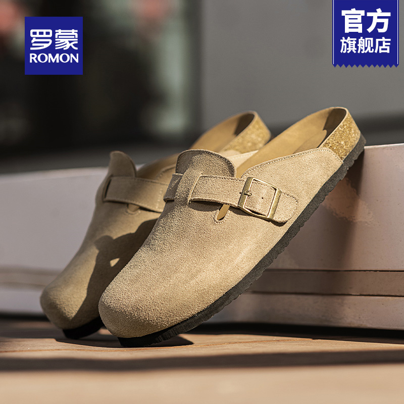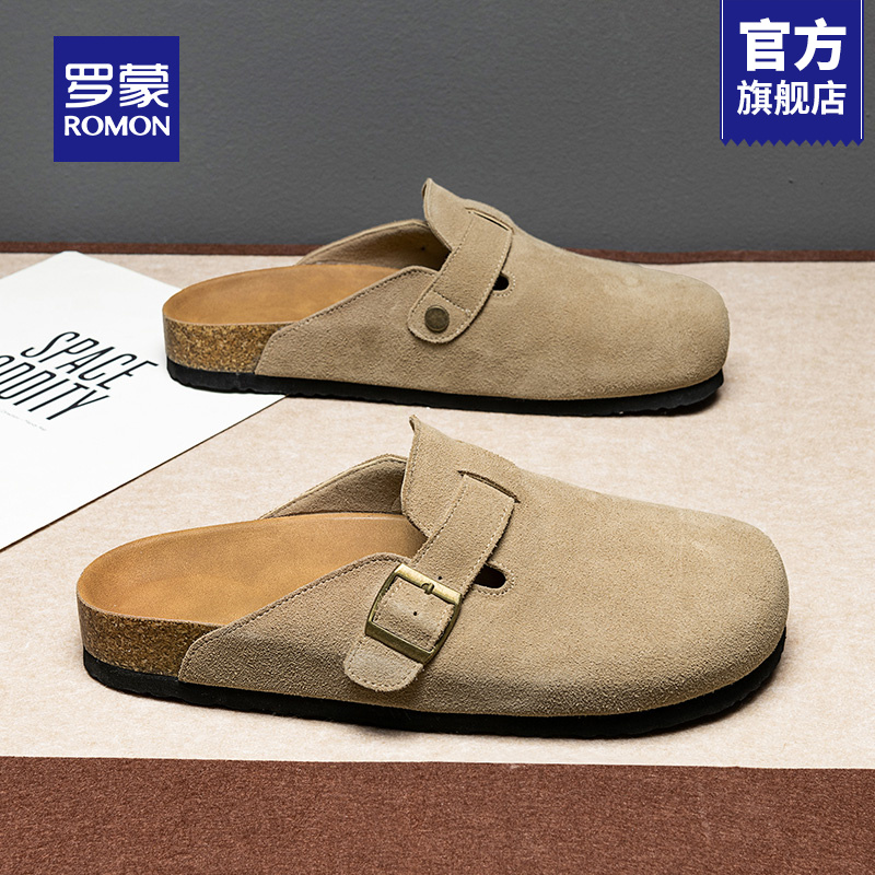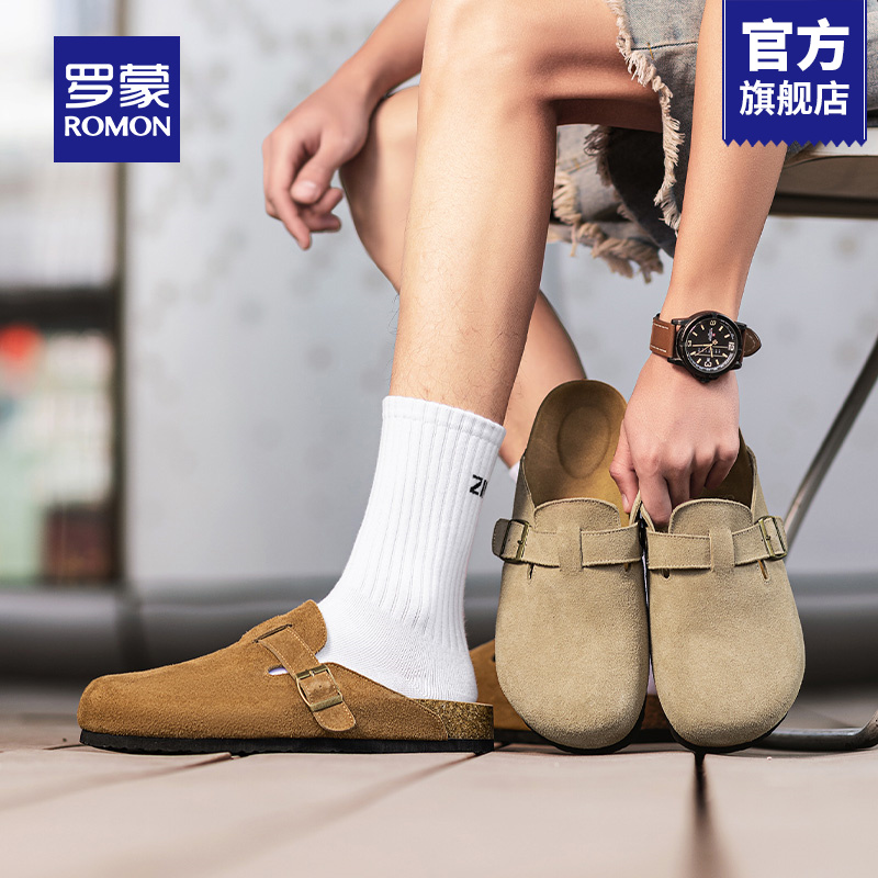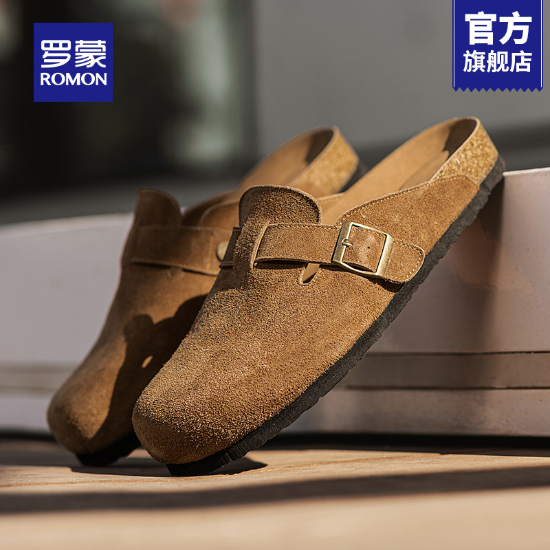 罗蒙勃肯鞋男款2025新款夏季真皮复古懒人半拖鞋一脚蹬包头拖鞋RM