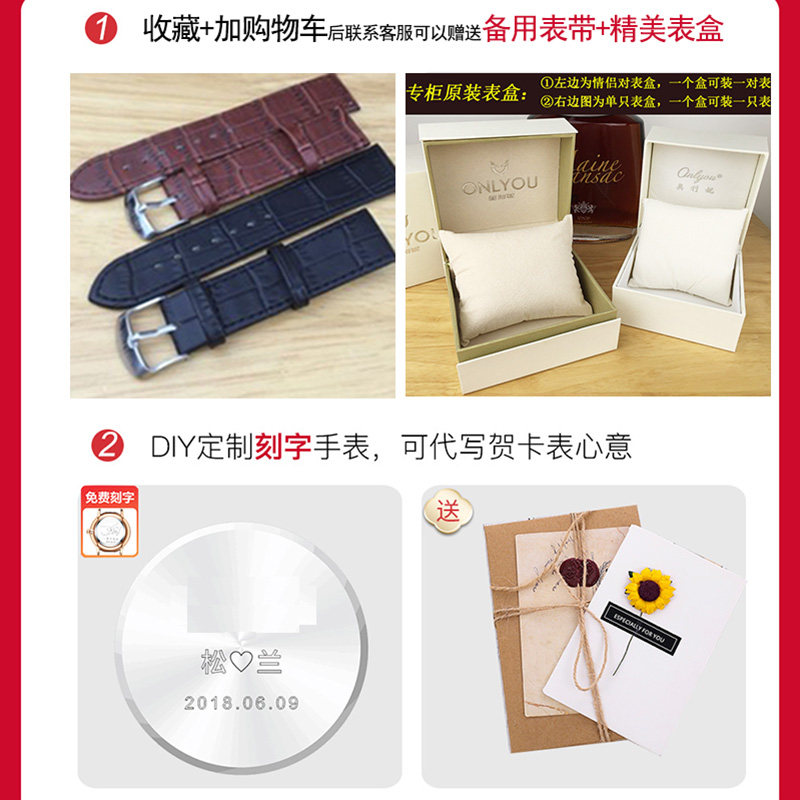 正品onlyou奥利妮情侣表时尚防水真皮带日历男女对表石英情侣手表
