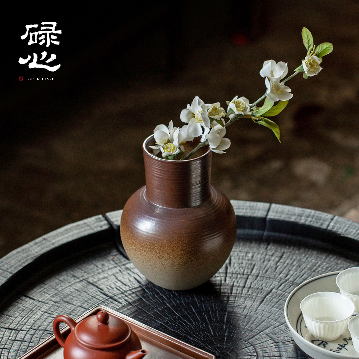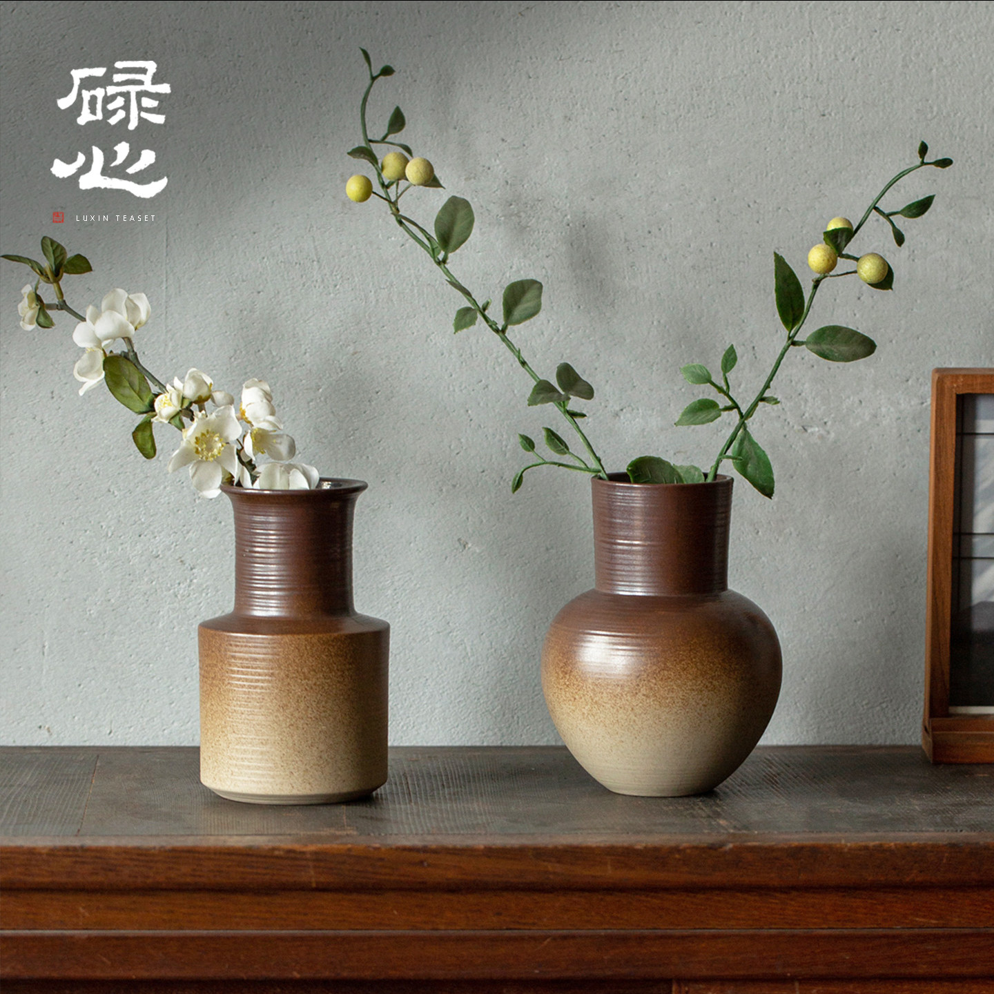 碌心 柴棕釉花瓶复古中式 粗陶插花陶瓷器大口径侘寂风水培小花器