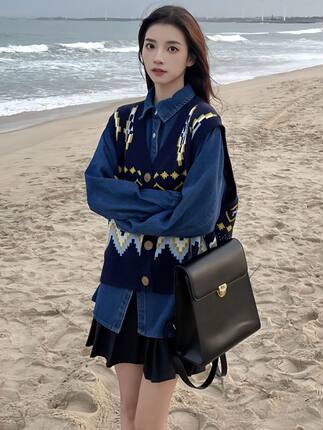 复古港风套装女早春新款牛仔衬衣搭配马甲半身裙一整套小个子chic