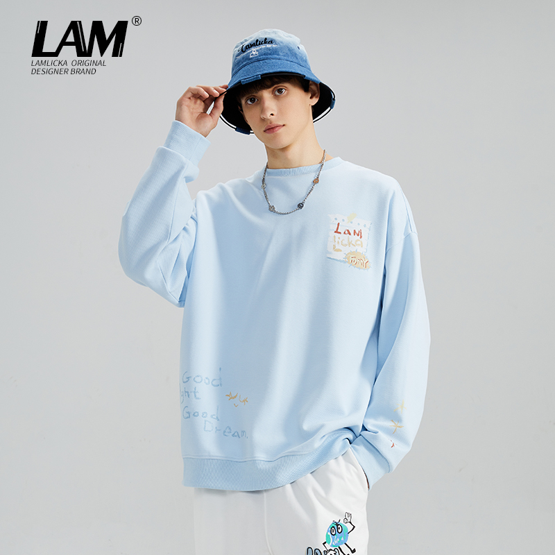 LAMLICKA秋冬新款蓝色圆领卫衣男卡通印花潮牌高街情侣装套头上衣