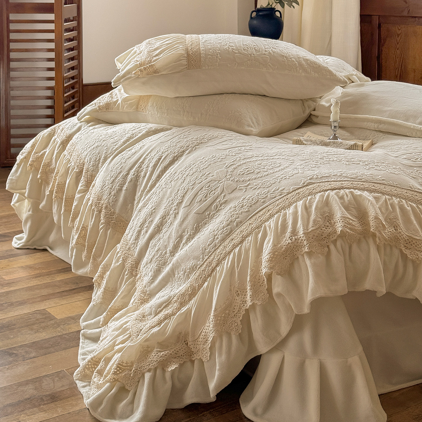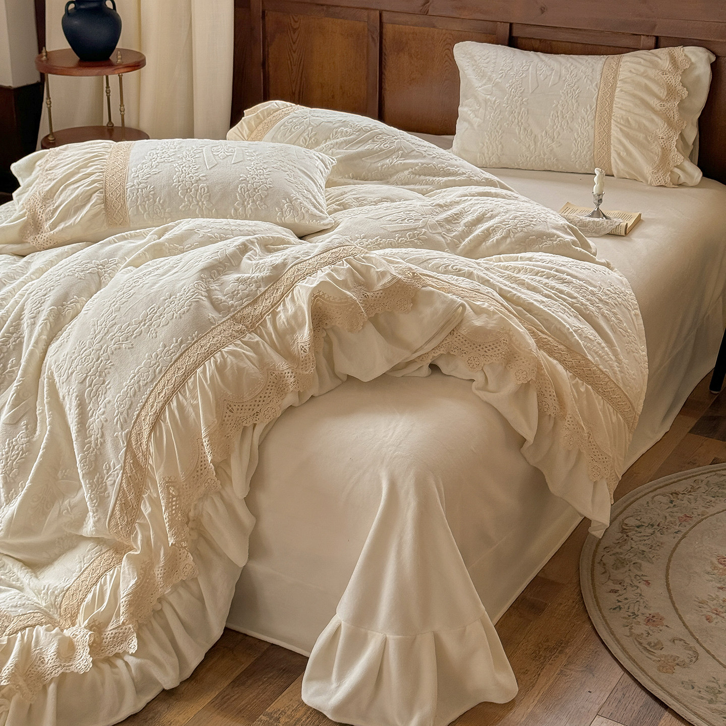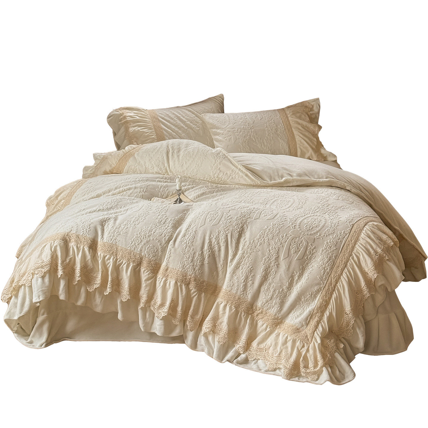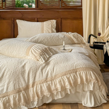 法式浪漫荷叶边牛奶绒四件套冬季珊瑚绒保暖白色雕花被套床上用品