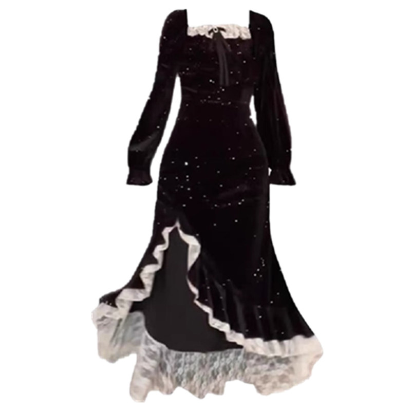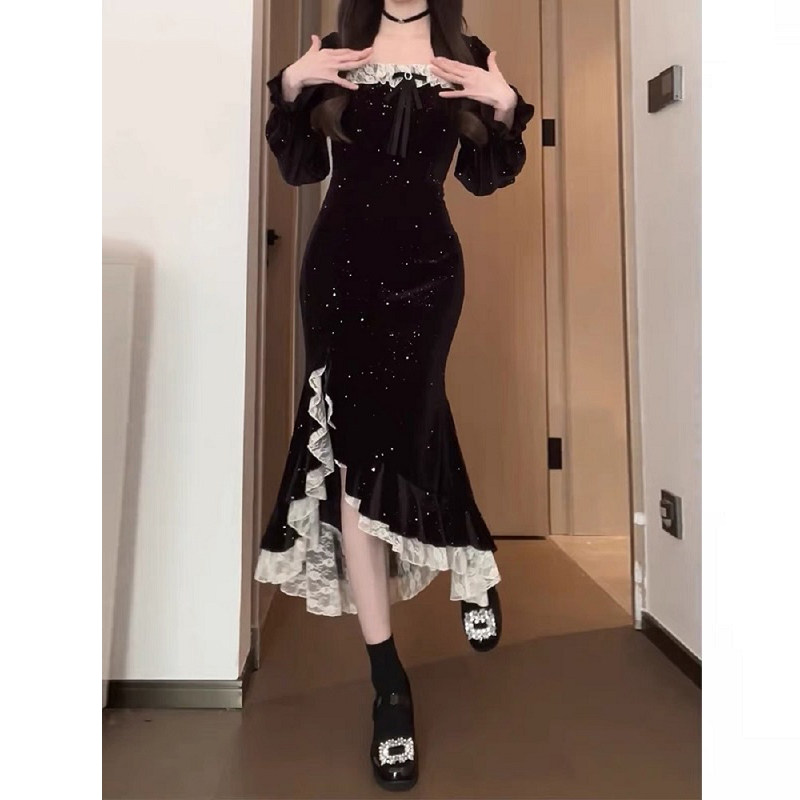 大码胖mm纯欲高级感蕾丝拼接开叉亮闪丝绒连衣裙女秋冬显瘦鱼尾裙