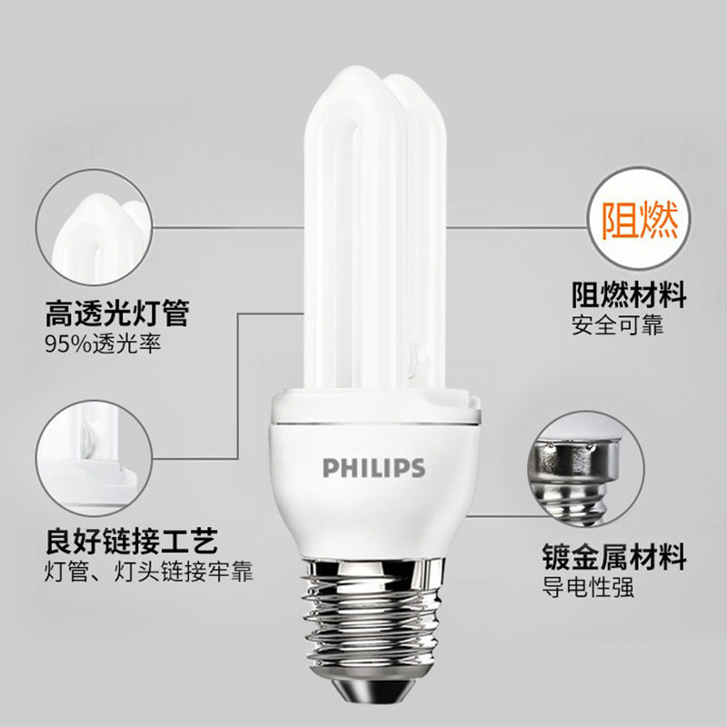 飞利浦2U节能灯E27螺口E14螺旋U型led灯泡家用螺纹正品灯管超亮5w