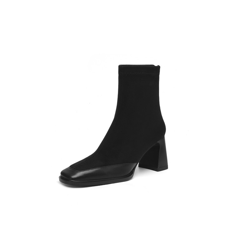 2025秋冬季复古粗跟短靴女拼接防水台超火弹力瘦瘦靴高跟短