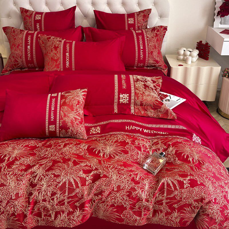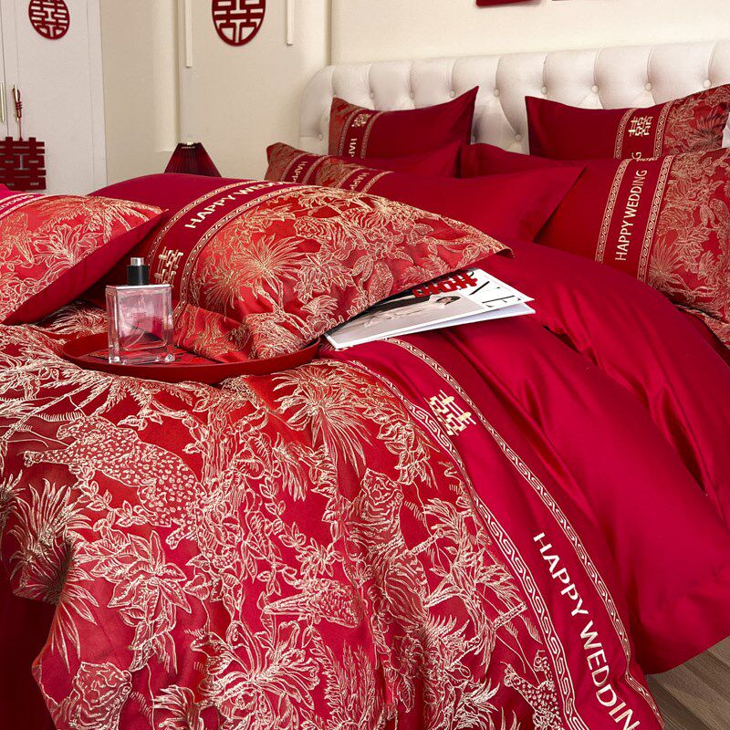 轻奢新中式结h婚纯棉四件套喜庆红色婚庆全棉床单被套陪嫁床上用
