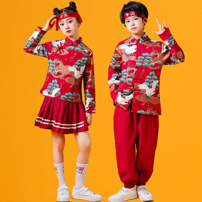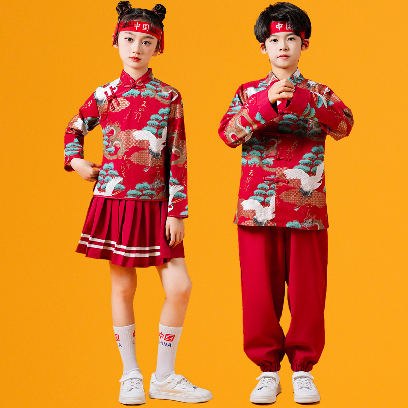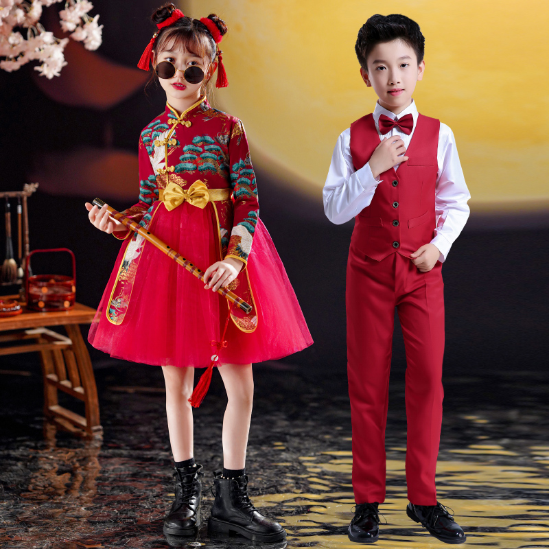 元旦儿童演出服中国风幼儿园表演服小学生大合唱团服装红色蓬蓬裙