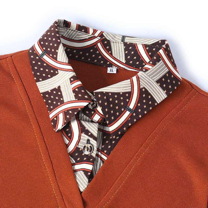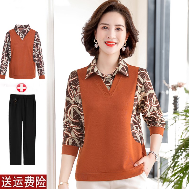 中老年女装洋气上衣假两件打底衫女士长袖T恤衬衫春秋新款套头衫