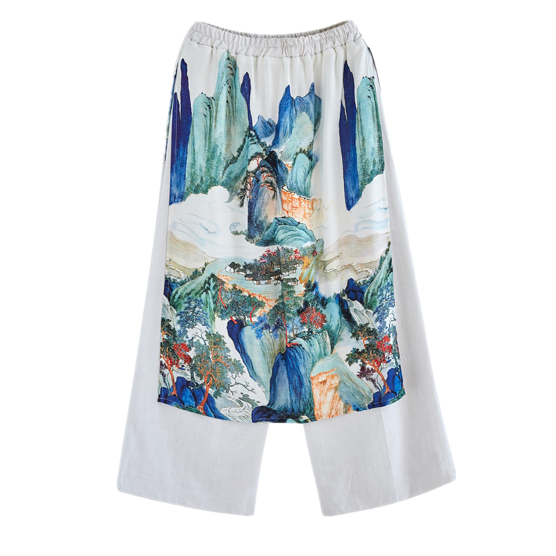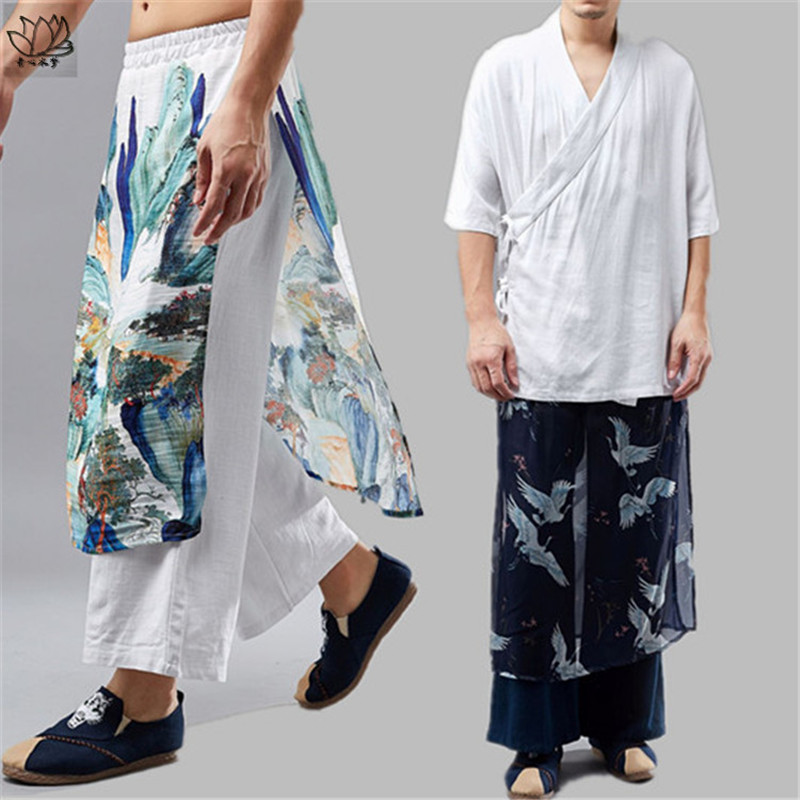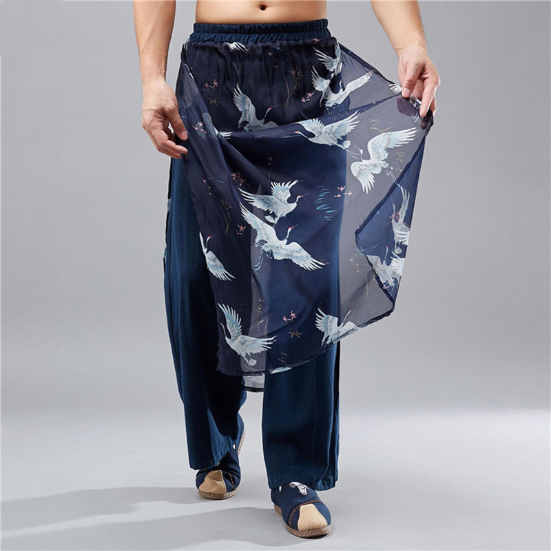 春夏中国风潮男装飘逸仙鹤亚麻拼雪纺双层中式复古阔腿裤裙九分裤