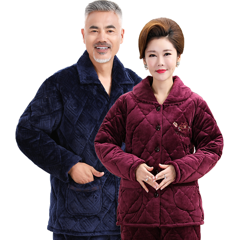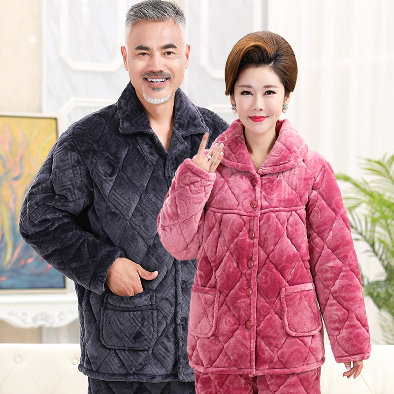 秋冬季中老年人珊瑚绒睡衣男女棉袄加绒加厚爸爸妈妈夹棉家居服