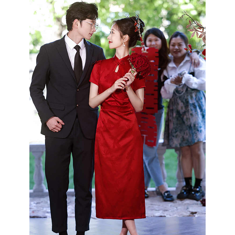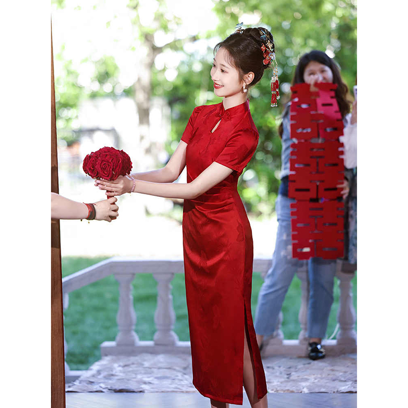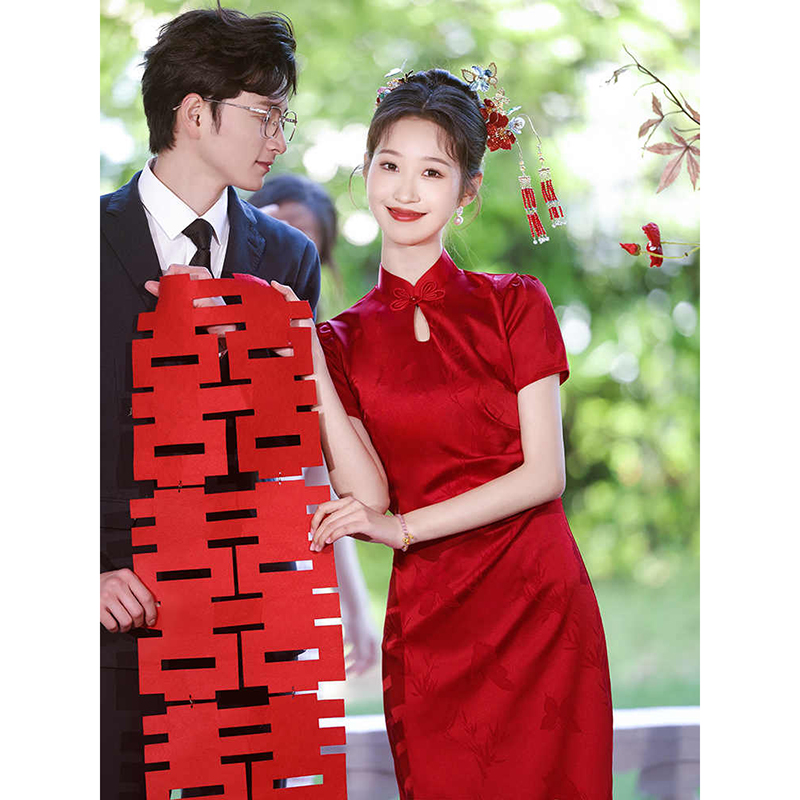新中式红色收腰旗袍敬酒服新娘订婚礼服裙女出阁宴连衣裙结婚便装