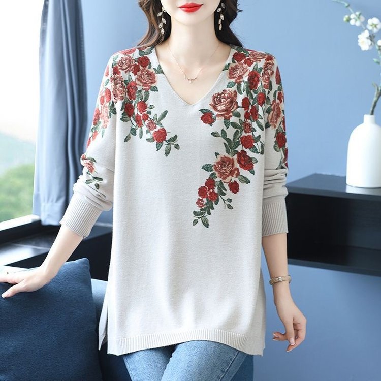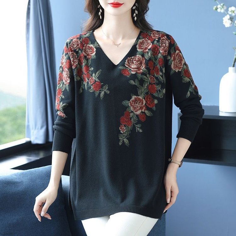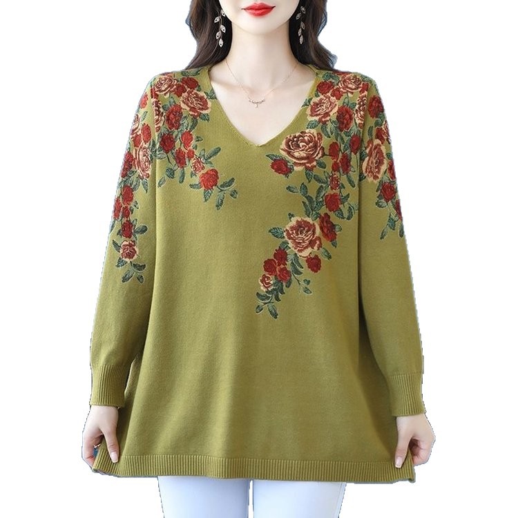 妈妈秋冬新款加大码显瘦中长款宽松遮肚v领毛衣打底衫女