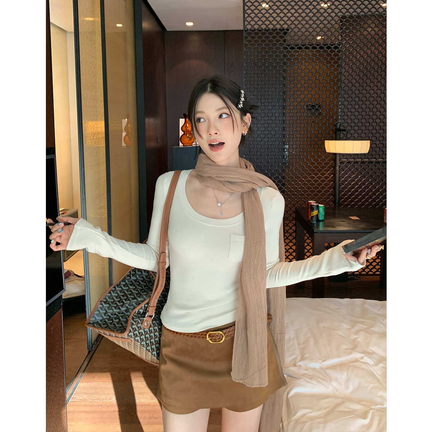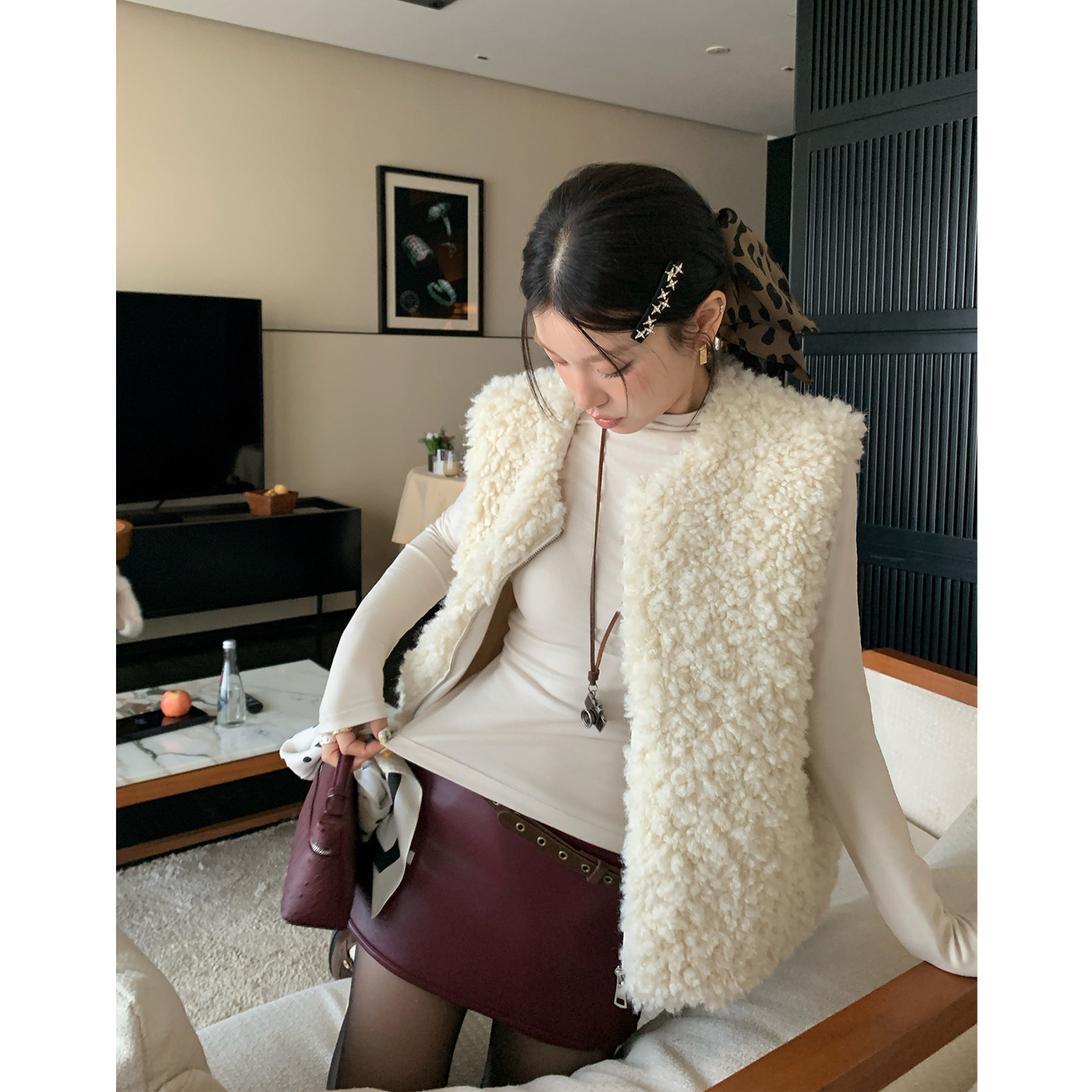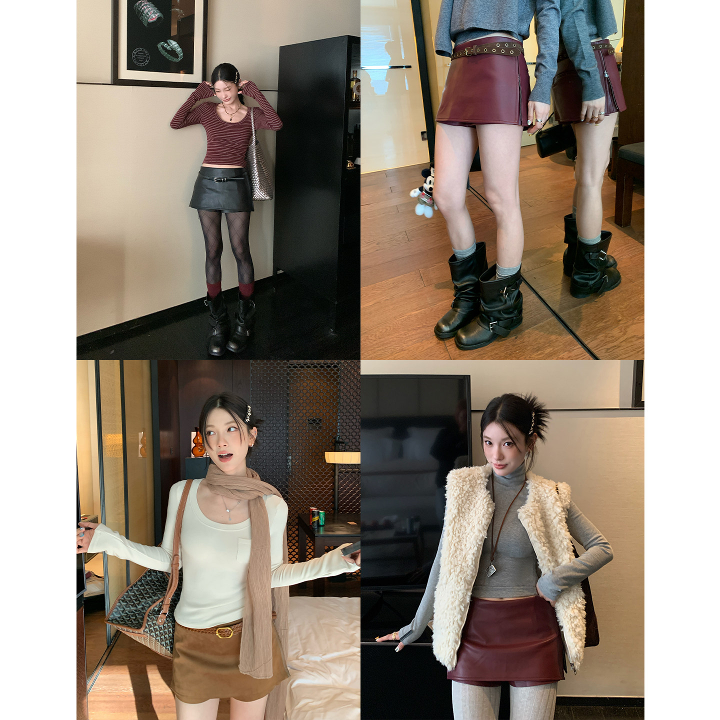 HAMYIHO麂皮pu皮侧边拉链短裙裤