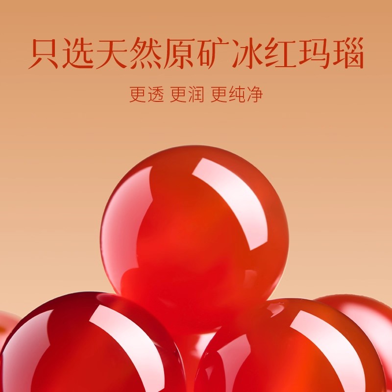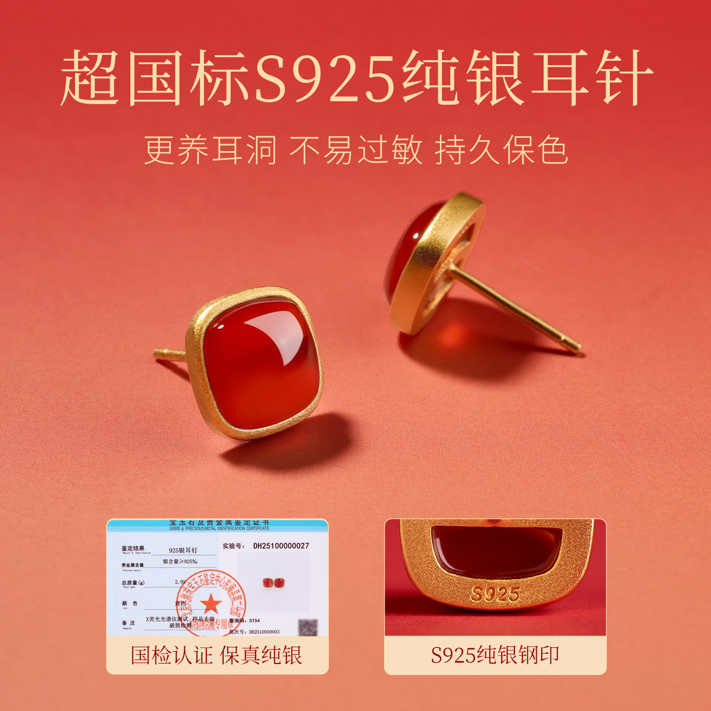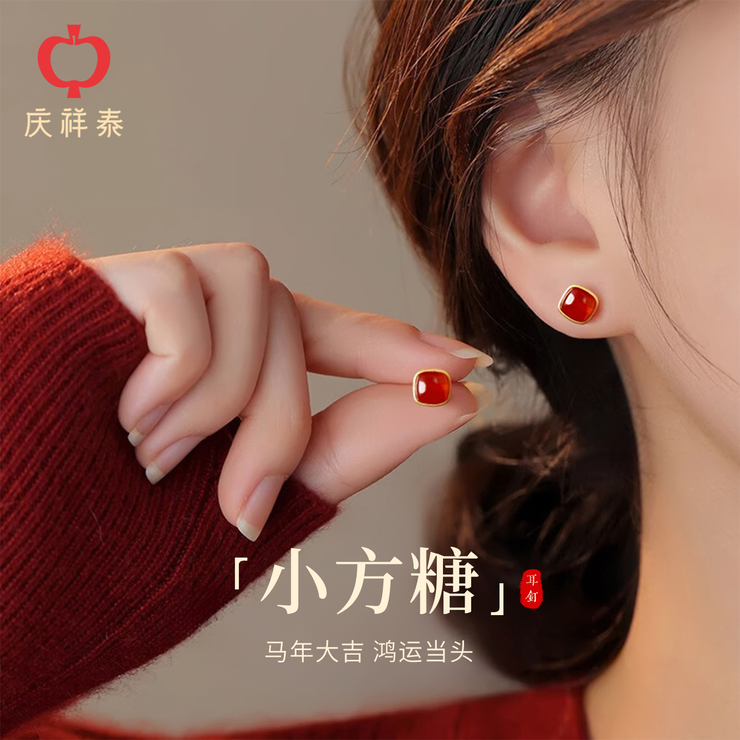 庆祥泰小方糖天然红玛瑙耳钉纯银女士新年本命年圣诞节礼物送女友