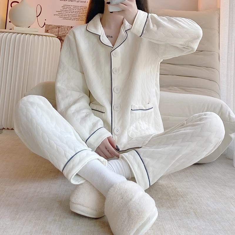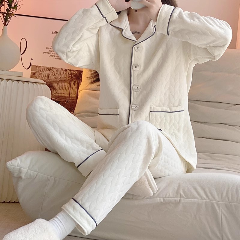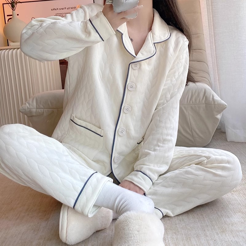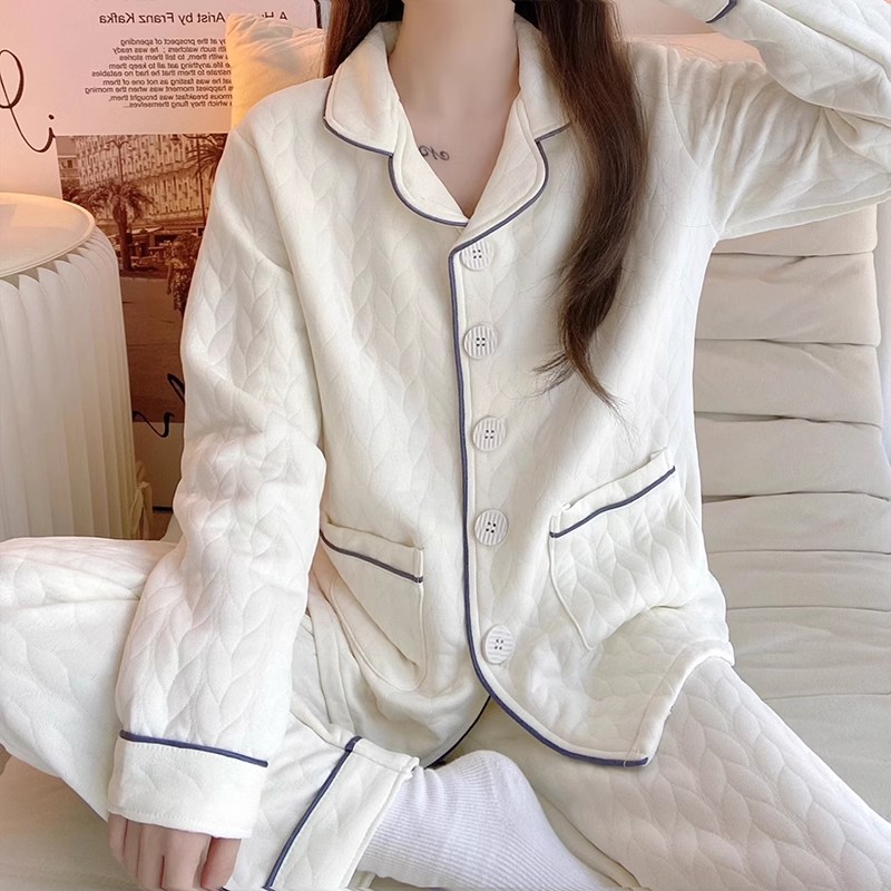 秋冬睡衣女春秋款长袖加厚纯棉空气棉2023年新款提花米白开衫套装