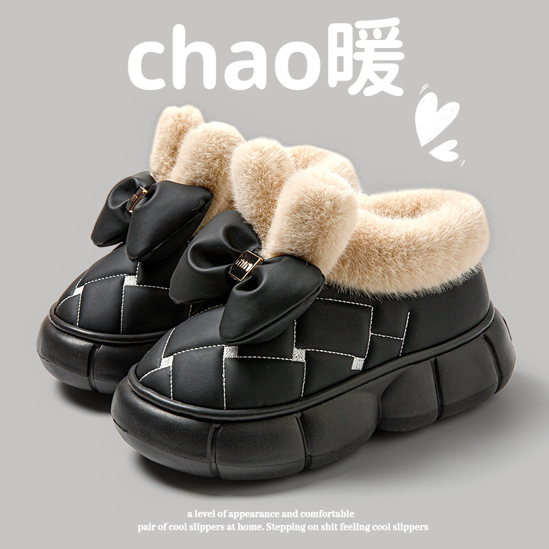 包跟棉拖鞋女厚底增高网红可爱居家拖鞋冬季加绒保暖PU皮棉鞋外穿