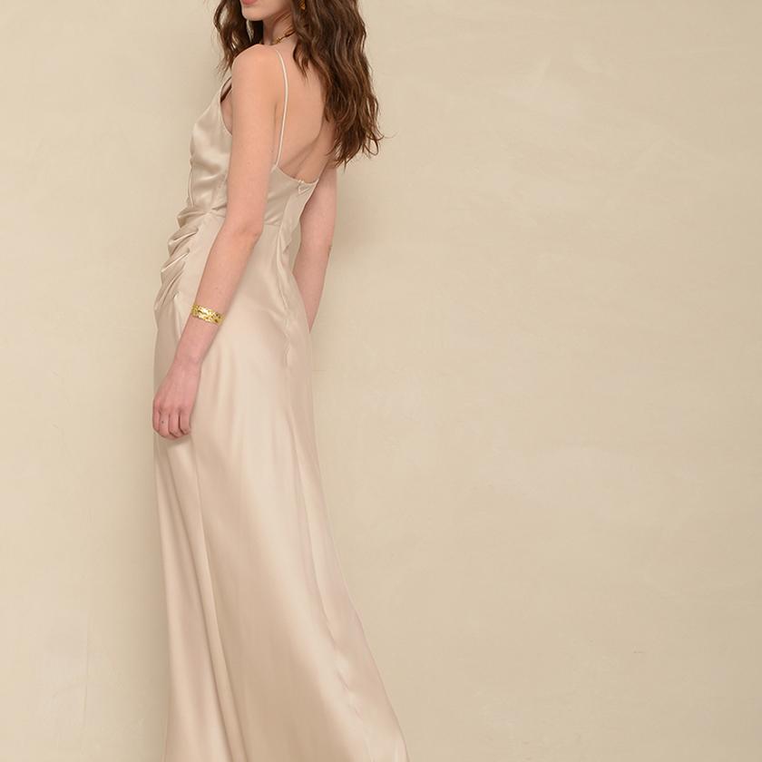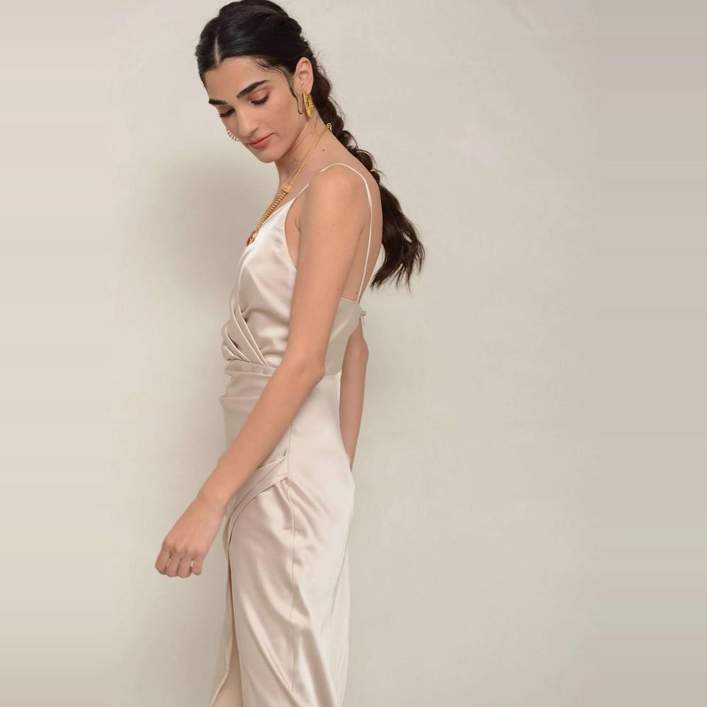 性感绝美香槟色缎面伴娘服礼服高级感显瘦深V鱼尾毕业典礼裙子